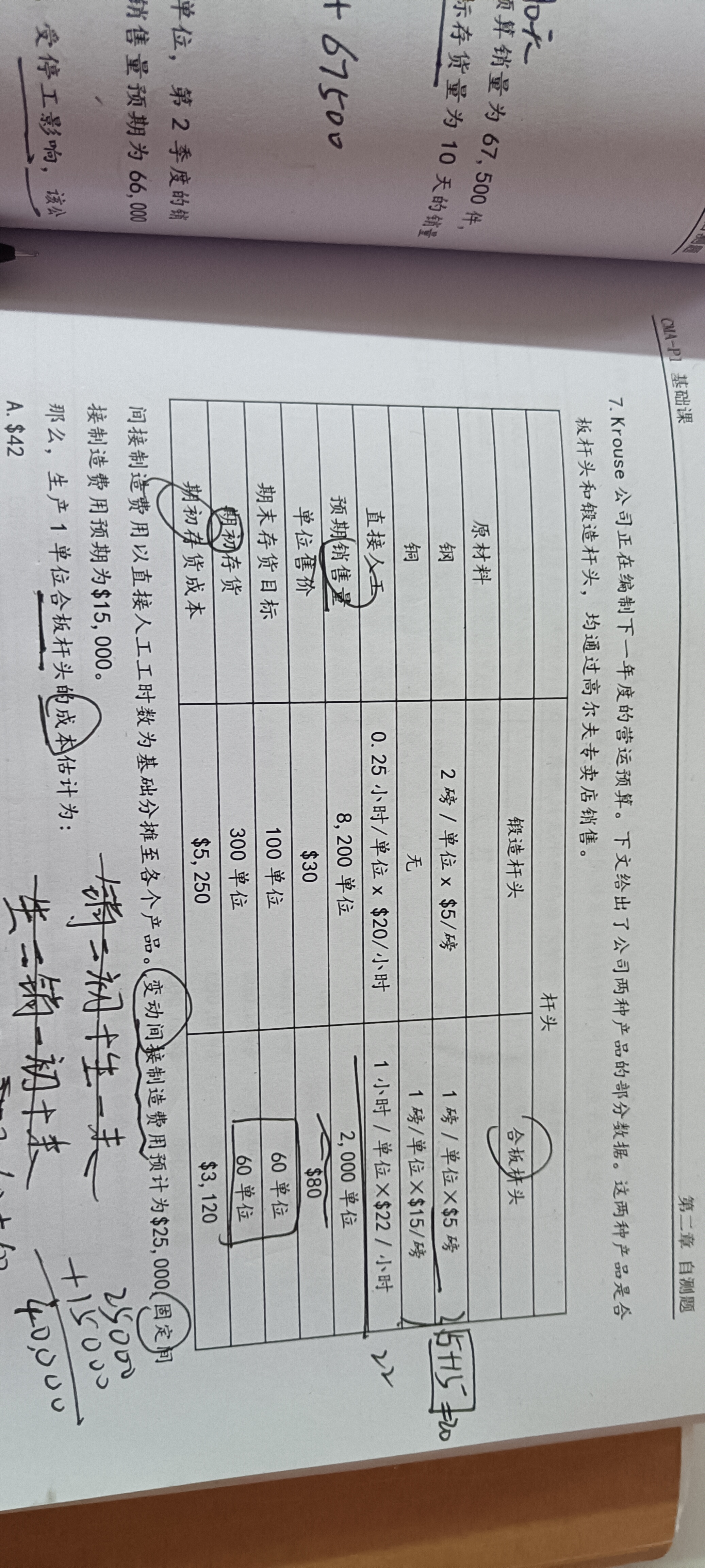 同学你好,(1)1单位产品成本首先分为直接材料、直接人工、间接费用。从题目中可以得知:1单位直接材料$20,1单位直接人工$22。(2)间接费用的分摊基础是人工小时,所以我们需要计算人工小时数。1.首先我们来看锻造本期生产数量=本期销售数+期末库存-期初库存=8200+100-300=8000。又因为1单位合板花费0.25小时,所以本期生产锻造占用2000小时。合板本期生产数量=本期销售数+期末库存-期初库存=2000+60-60=2000。又因为1单位合板花费1小时,所以本期生产合板占用2000小时。所以分摊基础时间小时数为2000+2000=4000小时。间接费用=25000+15000=40000,所以每小时数=40000/4000=10,又因为生产1单位合板花费是1小时,20美元,所以1单位合板成本=直接材料+直接人工+制造费用=20+22+10=52