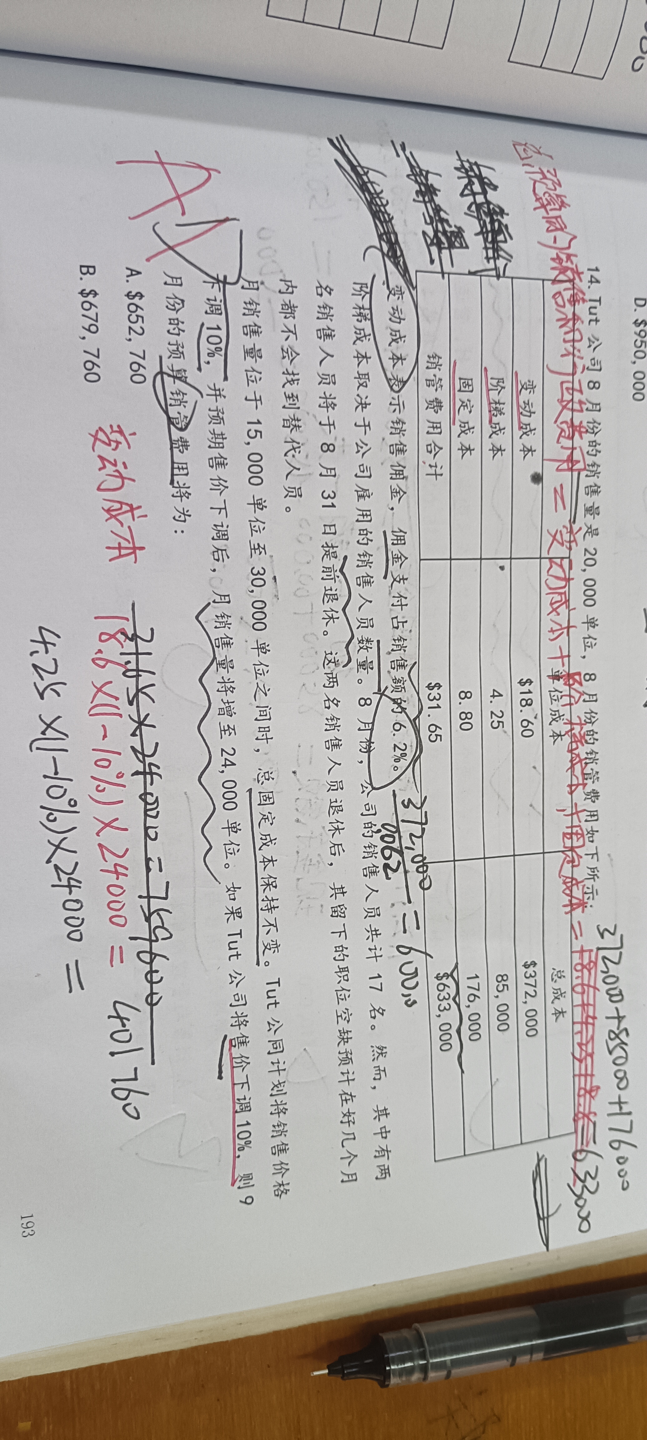 解:(1)固定成本=176000(2)阶梯成本=85000/17×15=75000(3)变动成本:首先计算产品单价:20000件×单价×6.2%=372000,所以单价=300。所以变动成本=24000×300×(1-10%)×6.2%=401760。(4)成本=固定成本+阶梯成本+变动成本=176000+75000+401760=652760(5)这一类题目需要记住的知识点:在相关范围内,变动成本总额随着业务量增加而增加,单位变动成本保持不变;固定成本总额保持不变,单位固定成本随着业务量增加降低,但一定要记住是在相关范围内。(6)同学你好,是不是快要考试了,所以在刷题阶段,我记得昨天也问了一道除了数字有改动外一模一样的题目,面对错题要加以总结哦。不要慌张,加油!