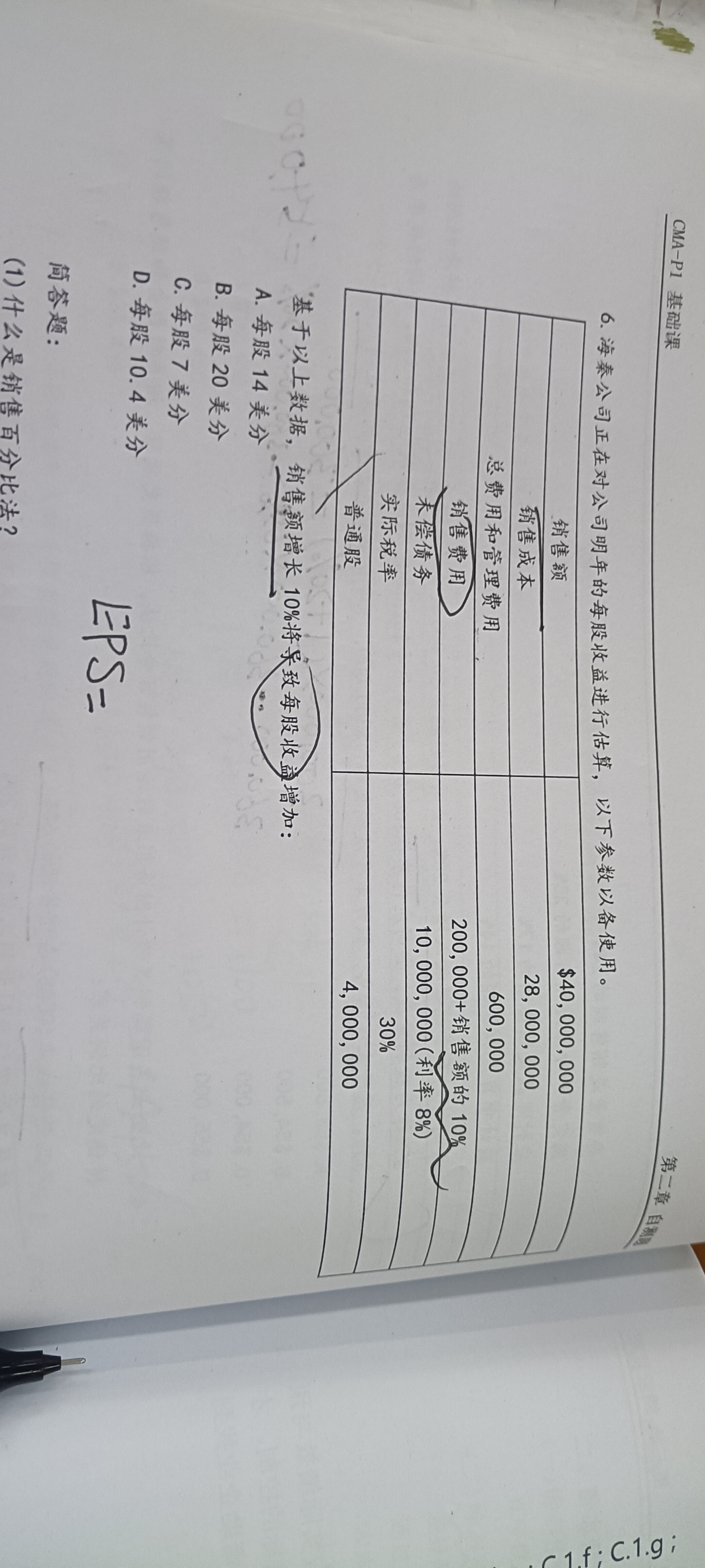 (1)销售额增加10%,说明销量增加了,单位成本与价格不变,所以增加后是:4000×(1+10%)-2800×(1+10%),所以相比之前的增加额为:(4000—2800)×10%。(2)销售额增加10%,所以是(1+10%),不是20%