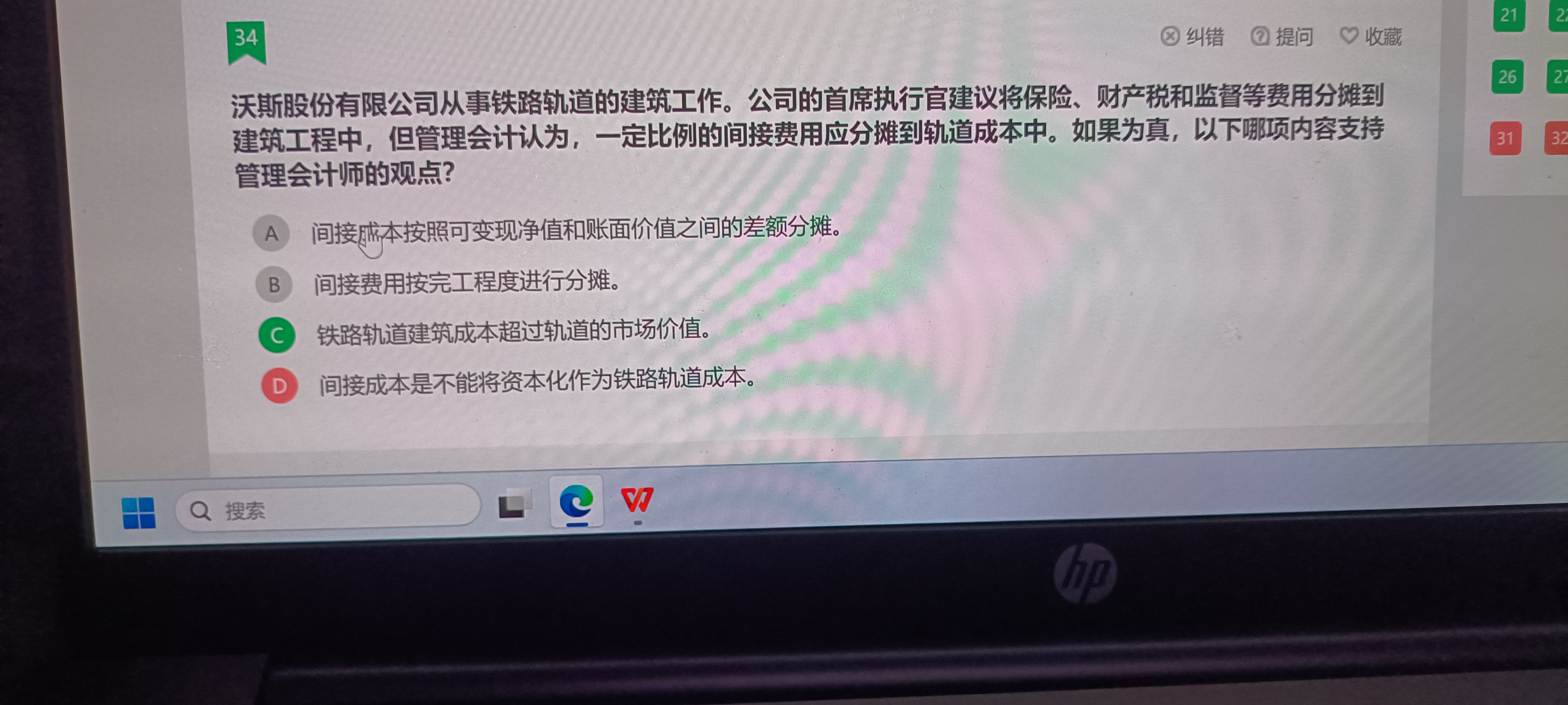 同学你好,(1)题目中的意思是:公司的首席执行官建议认为间接费用可以全部划分到建筑工程中;但管理会计认为,一定比例的间接费用可以分摊到轨道成本中,而不是全部。题目问:支持管理会计观点的选项是?(2)C选项:当间接费用太多,已经超过将来轨道出售的公允价值,超过部分不能资本化,不能计入轨道成本,需要当期费用化,计入损益。