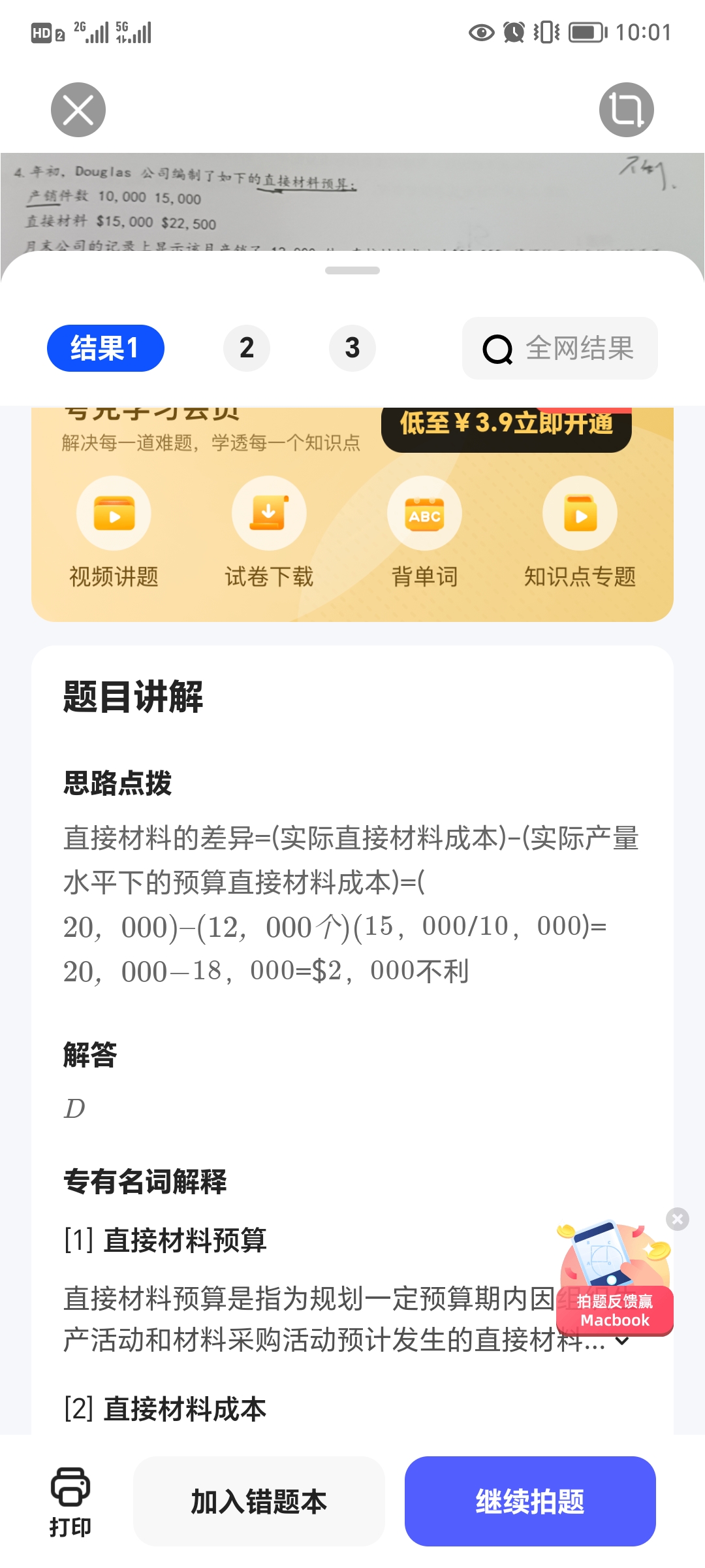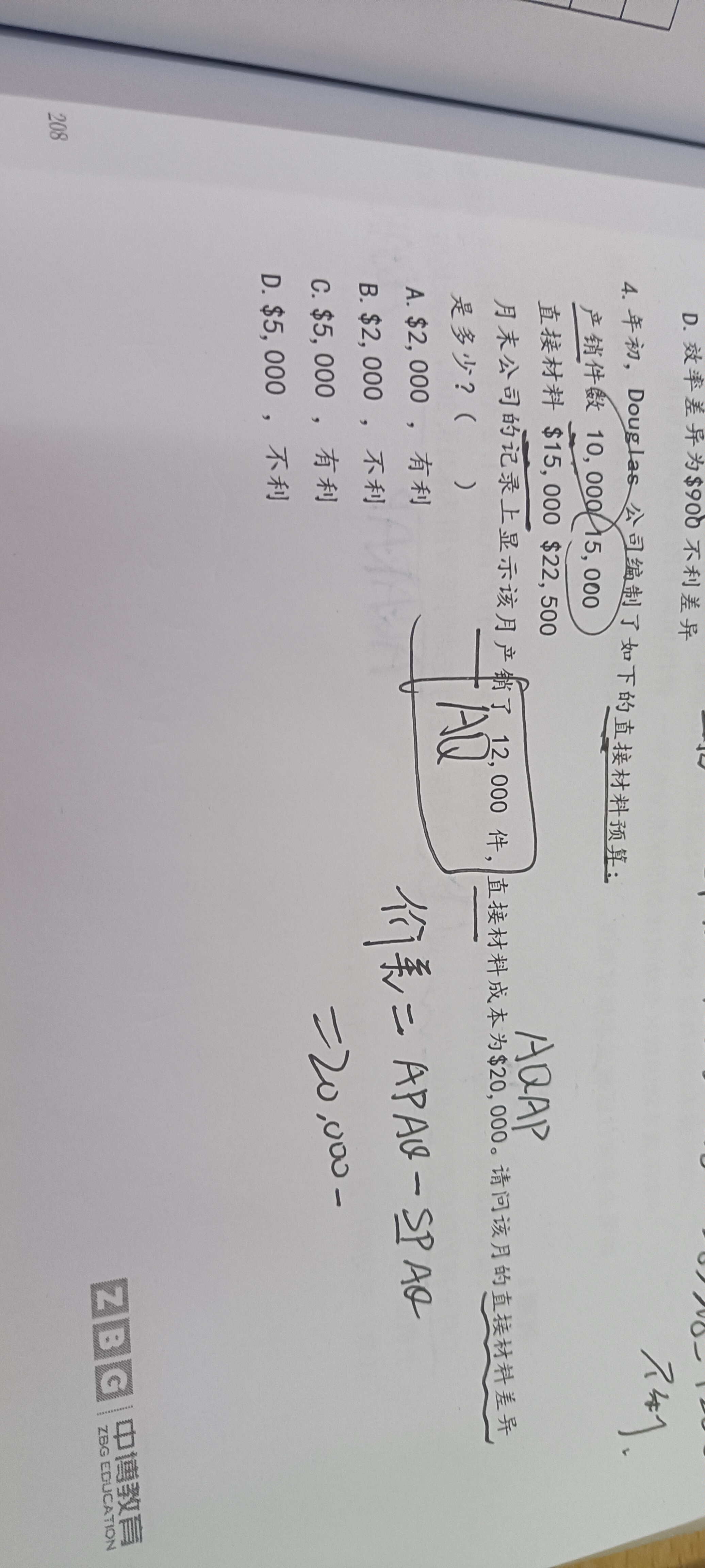 同学你好,首先看题目信息:显示月销量12000件,已知实际成本数,所以需要计算月销量12000件时的预算成本数。已知预算情况下:15000情况下,成本22500,10000情况下,成本15000,用插值法,设12000情况下,材料成本X。所以:(15000-10000)/(22500-15000)=(15000-12000)/(22500-X) ,得X=18000。直接材料差异=实际成本—弹性预算成本=20000-18000=2000,不利差异