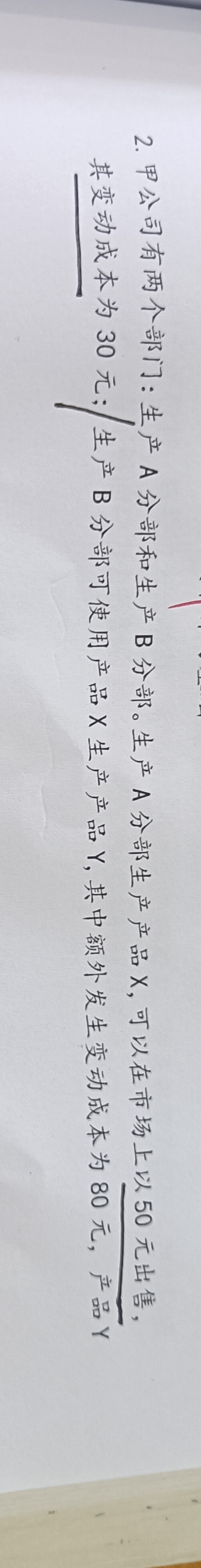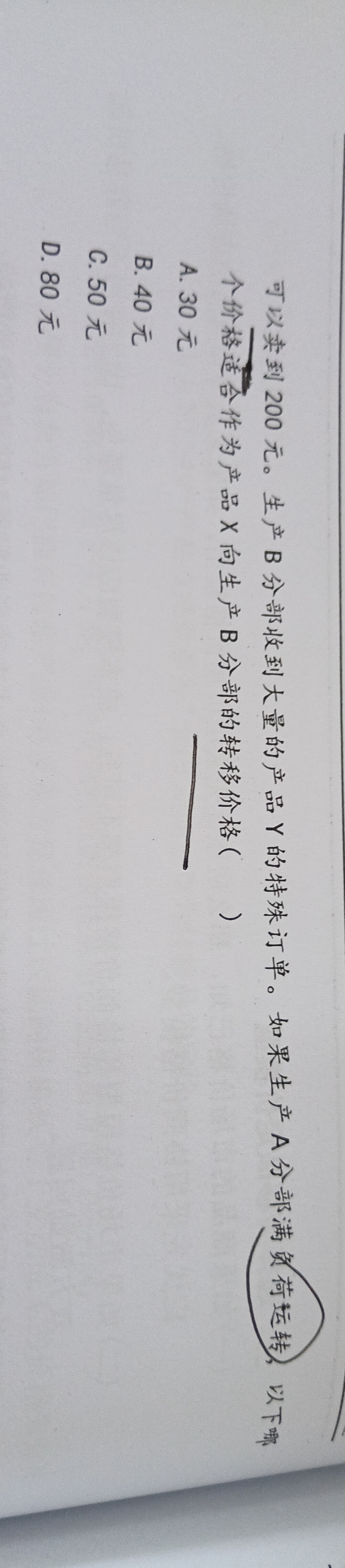 解:卖方部门没有剩余的产能(满负荷运作),(因外部市场对卖方的产品是供不应求的状态,即使卖方满负荷运作也未必能满足),因此按照外部的市场价格作为转移价格使卖方部门更加易于接受。所以选择C