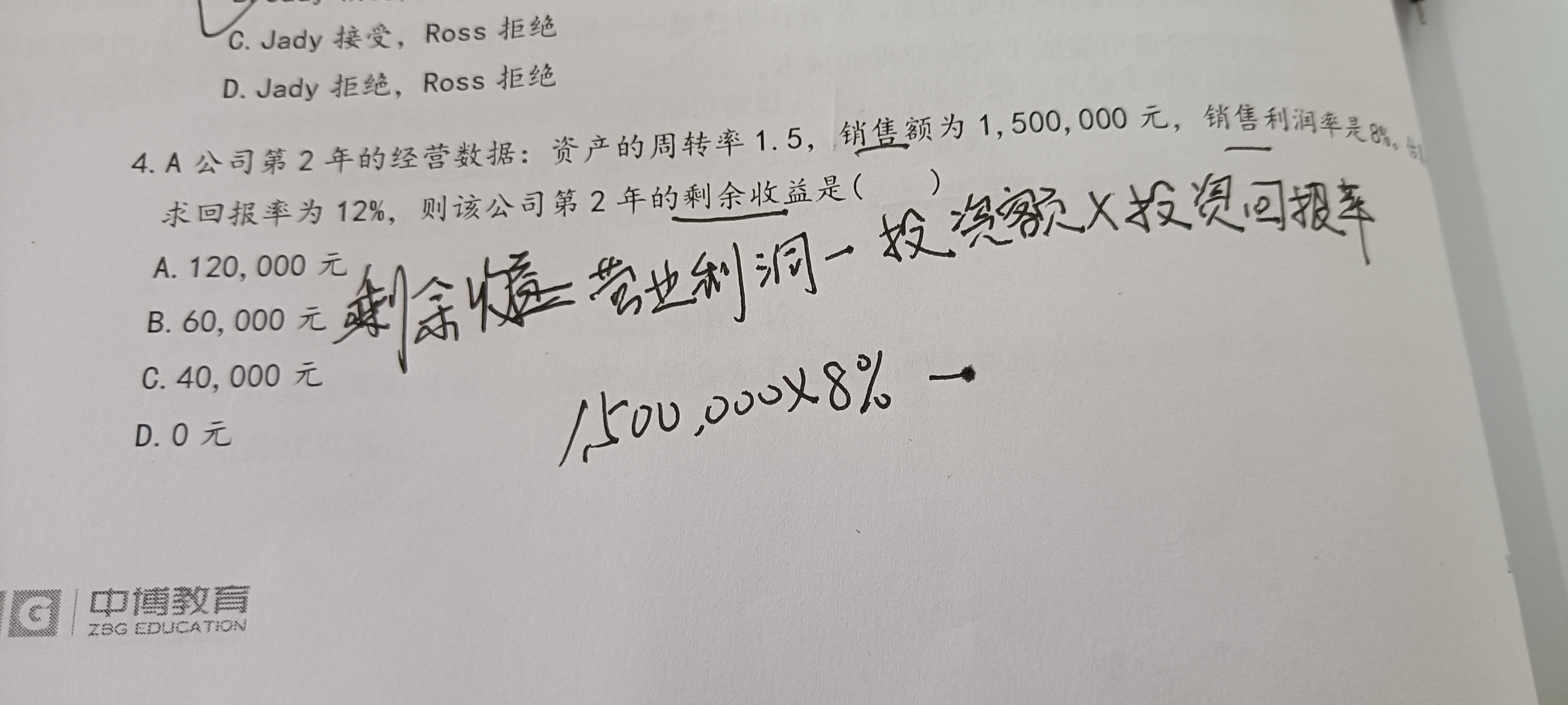 答:剩余收益=业务单位利润=(业务单位的资产×必要报酬率)。首先计算一下业务单位利润=1500000×8%=120000。接着计算一下业务单位资产=1500000/1.5=1000000。(资产周转率=销售收入/平均总资产)。所以剩余收益=1500000×8%-(100000×12%)=0