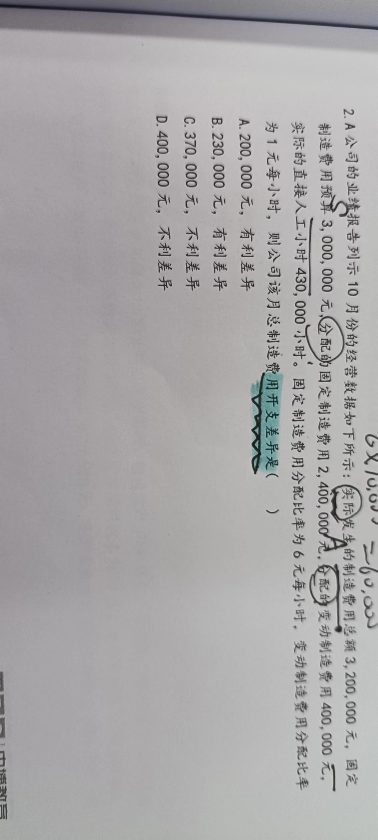 答:间接费用耗费差异 (OSV) = (实际间接费用) – (使用实际直接人工小时的预算间接费用)=3200000– (使用实际直接人工小时的预算间接费用) 。使用实际直接人工小时的预算间接费用= (固定间接费用) + (实际直接人工小时)(分摊变动间接费用的人工小时分摊率)= 3000000+ (430,000小时)($1/直接人工小时)= 3430000。所以开支差异=3200000-3430000=-230000,有利差异