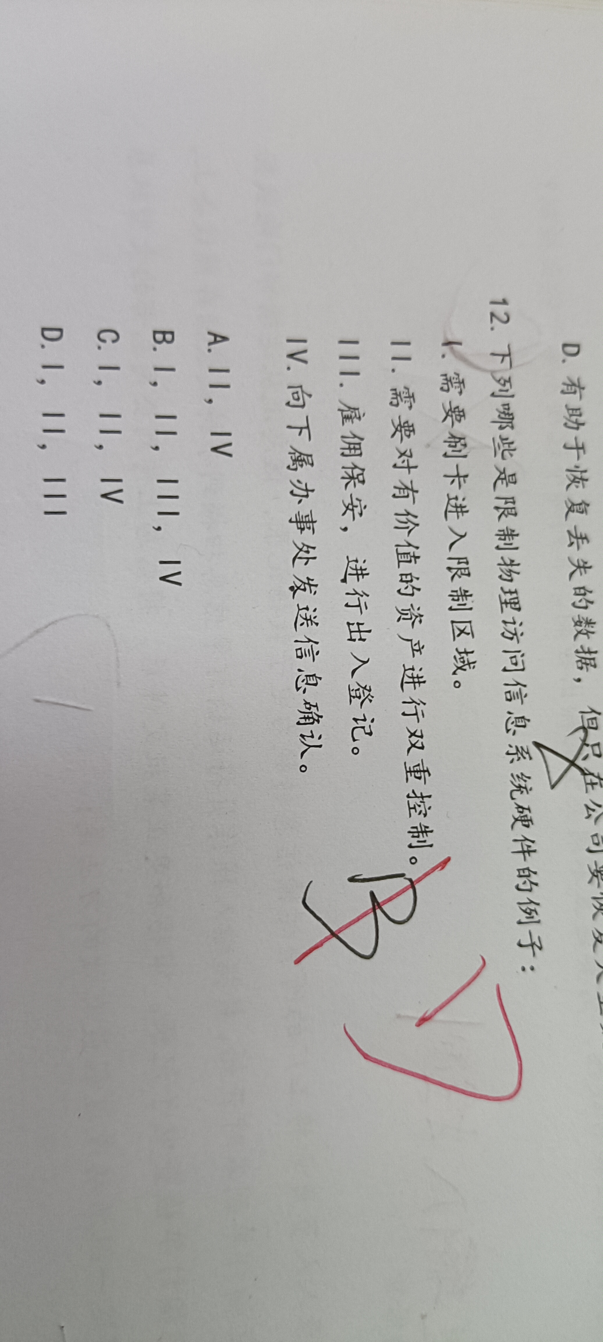 同学你好,(1)设备和硬件控制,包括控制未授权进入、对自然灾害和其他灾害进行保护、对进入数据中心控制、保护计算机设备免遭电压突变影响、硬件设备能应对数据峰值处理等(2)物理硬件控制其实就是我们日常能看到的空间里面的控制,不包括看不见的无形数据,比如信息确认就不符合。(3)第一道题目不选D选项的原因是:题目问的是控制访问限制,D选项只是会物理保护硬件,但并没有对人员访问做出限制。