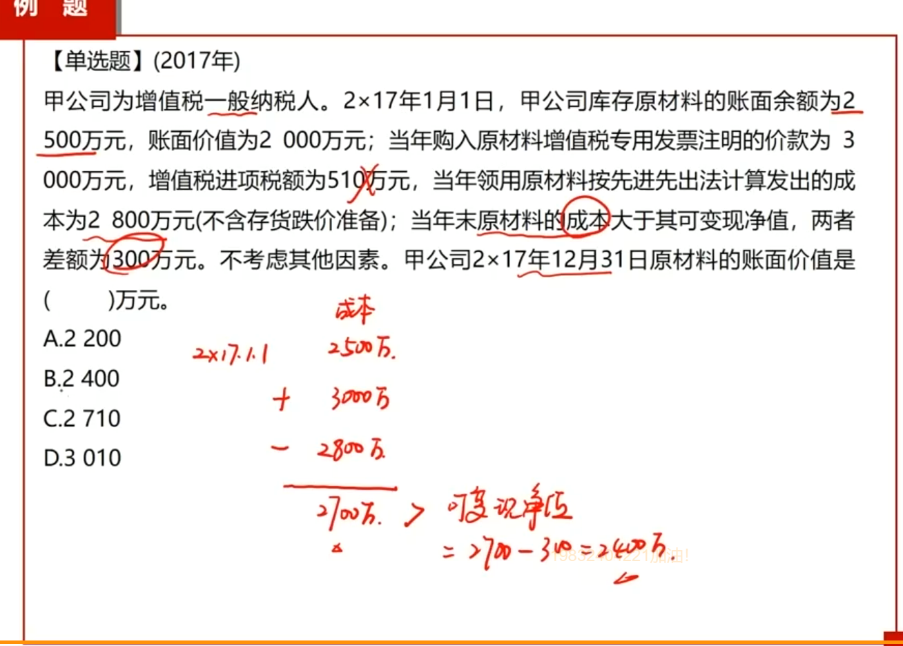 同学您好 这个地方是取得的增值税专用发票,涉及的增值税税额是计入:“应交税费-应交增值税(进项税额)”科目而非存货科目,所以在计算存货的账面价值时不考虑这个510