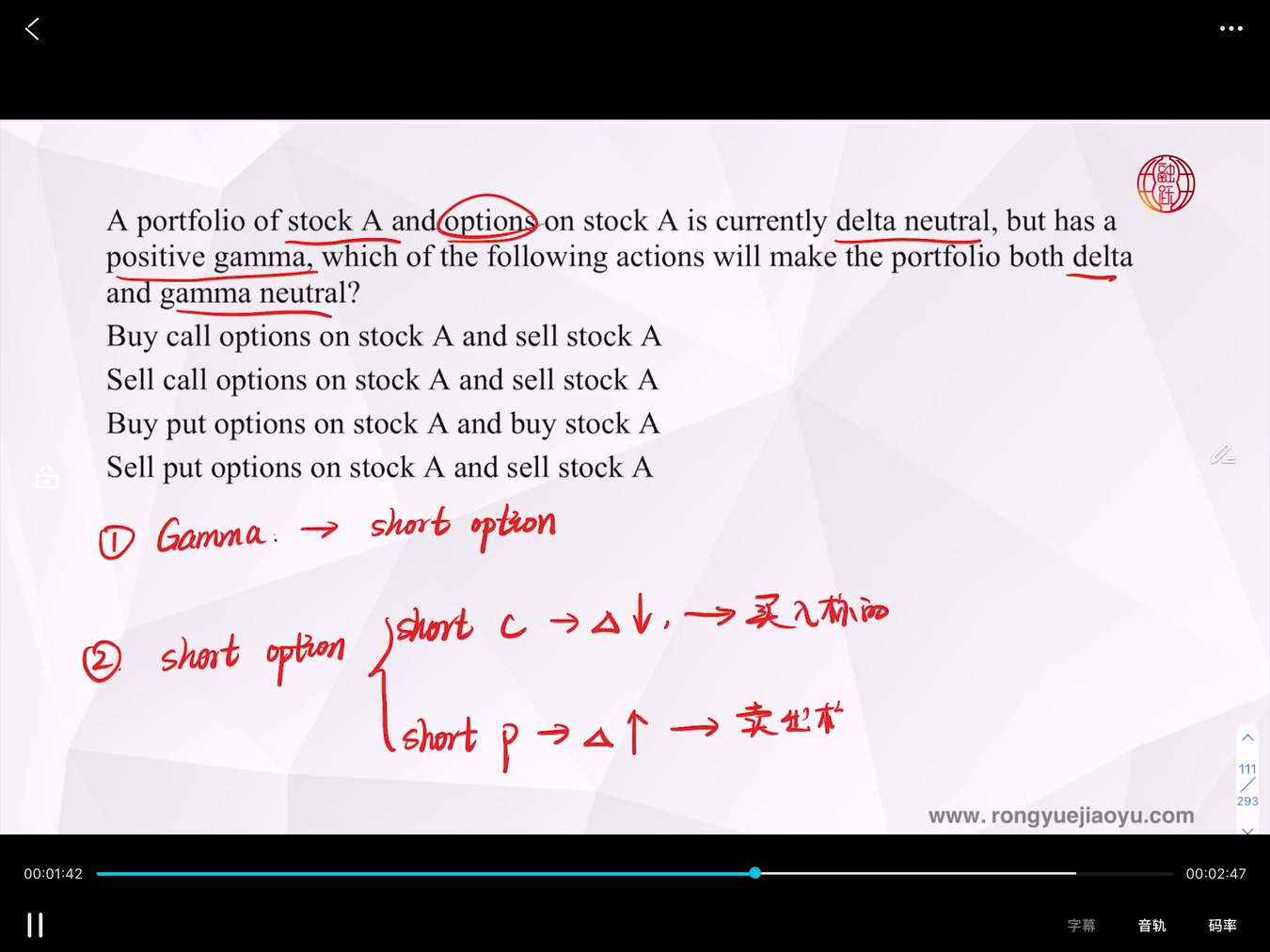 同学你好,因为对于看跌期权的多头而言,其delta是负数,反之对于看跌期权的空头而言,其delta就是正数,当然是相对上升的;另外delta下降后为了保持delta中性(即delta=0),就需要增加delta,而增加delta的方法之一就是买入标的资产。