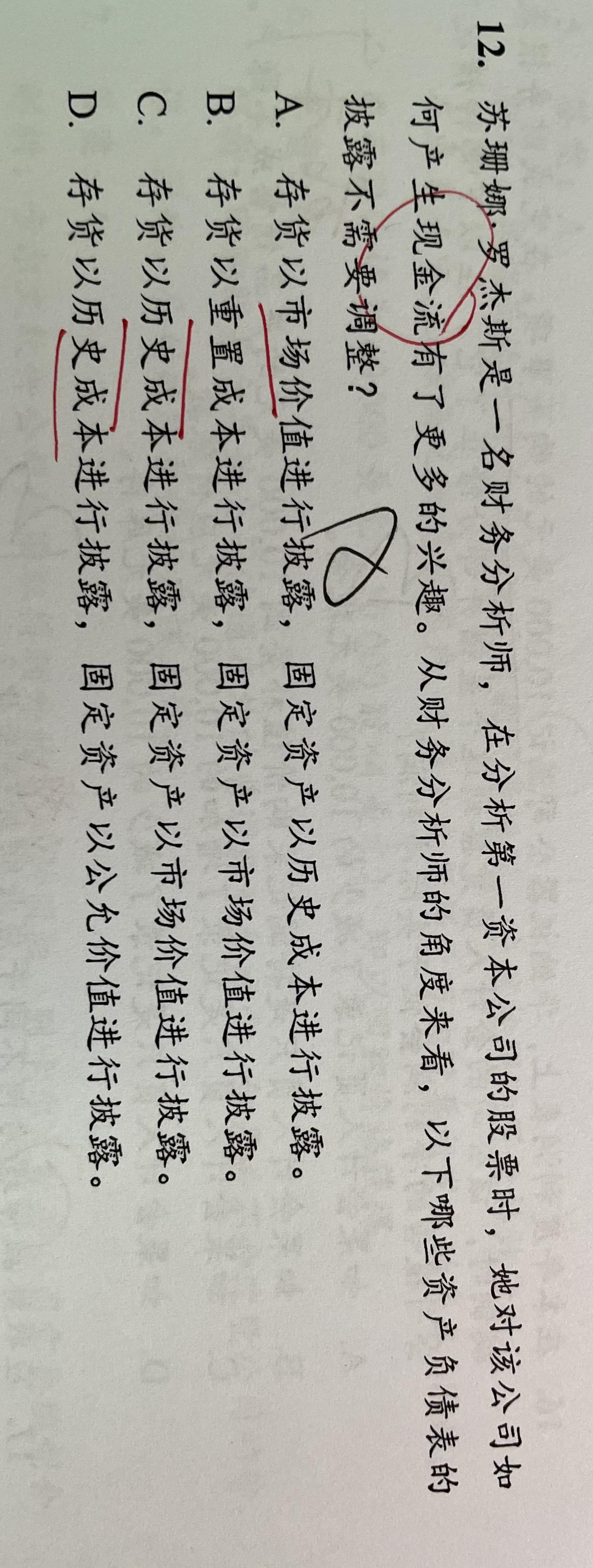同学你好,因为题目中的信息考点是:财务分析师、对现金流有更大兴趣。在一个企业中,分析最重要的特点就是贴近现实市场环境。A选项存货按照市场价值,分析师不用再对存货进行调节,默认为存货流动性强、流通能力强所以与市场保持接近。固定资产属于非流动资产,最重要的生产能力,按历史成本计量,更利于准确地估计折旧费用及折旧税盾。