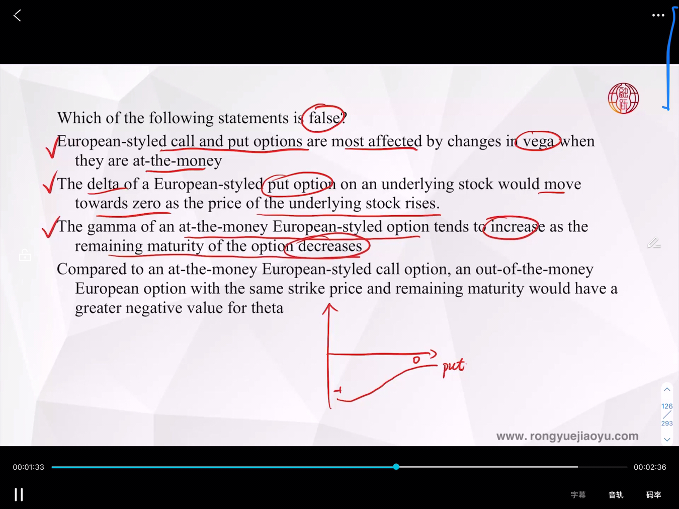同学你好,当b选项的put option是short时,则跟看涨期权是一样的,delta趋近于1,原因是delta的正负号跟多头还是空头以及看涨还是看跌期权都有关系.