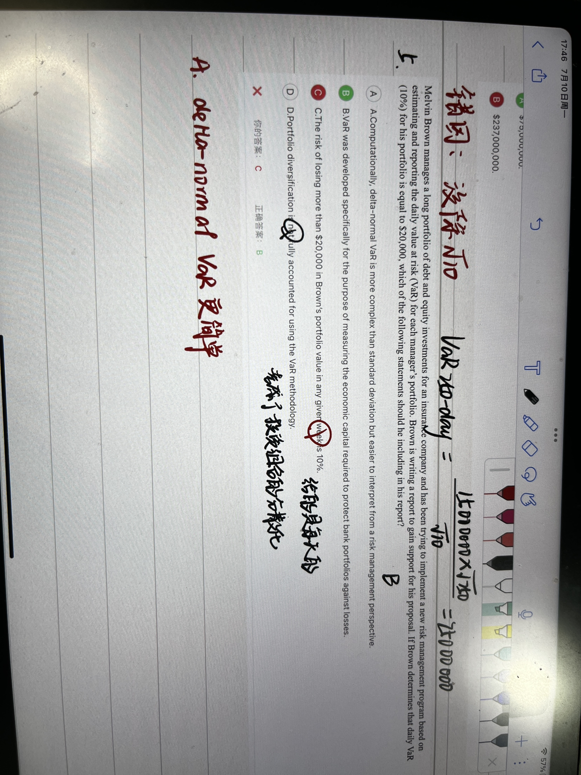 同学你好,从题干背景来说,推荐VAR方法时肯定是突出VAR的优点,而A选项同时说了优点和缺点,不妥;另外,VAR方法的计算跟标准差计算相比并不复杂,这一点并不是VAR方法的缺点。
