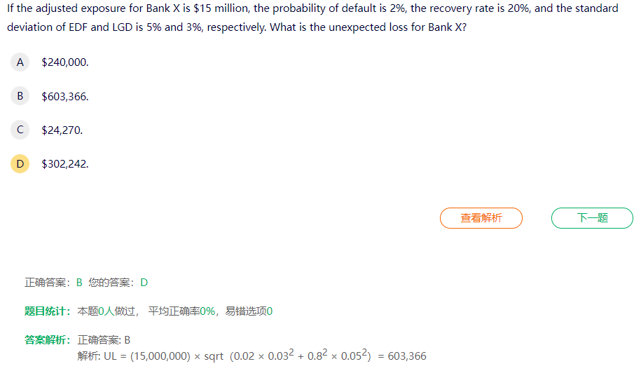 同学你好,这道题考察的是计算UL的一个计算公式,这个公式目前已经不考了,这个题目的位置是那里,这边删除一下。另外题目中EDF指的是预期违约频率,相等于违约概率。