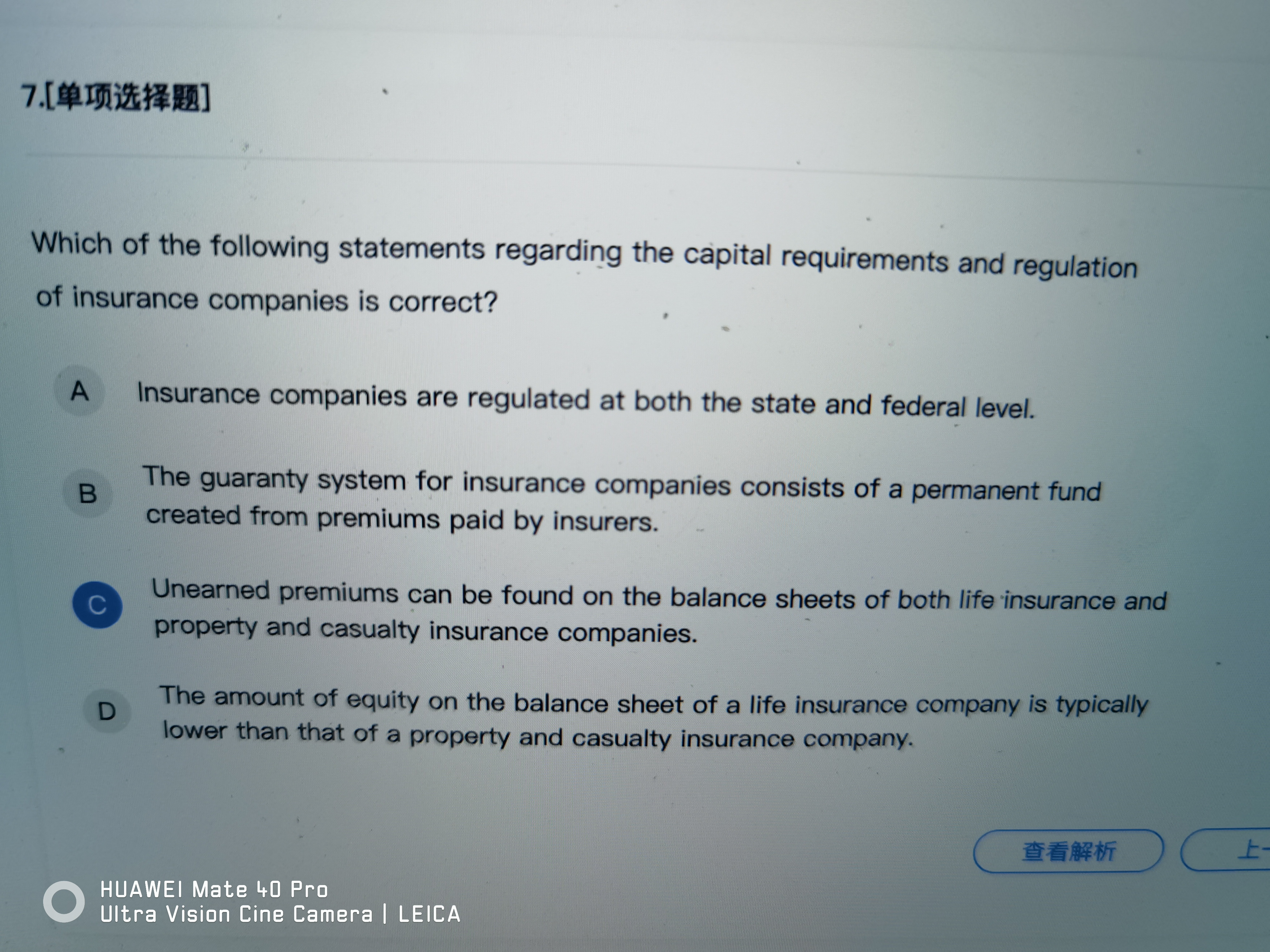 同学你好,C选项说的是Unearned premiums 这个点(比较偏,考试考的概率比较低),Unearned premiums 的意思保险公司为保险期限内未履行完责任而提取的准备金,比如当年6月1号卖出去的一年期保险,保险期限是到下一年5.31到期,而正常的会计年度是从1.1-12.31,所以所以下一年的六个月期限是跨年的,为了在会计上体现客观性和准确性,需要保险公司在本年报表上提取剩余半年的准备金以应对赔付,这种情况常见于非寿险公司(也就是财产险和责任险);寿险公司因为保险期限长,所以是另外一套核算机制,了解即可。 D选项,因为财产险的保险期限短,发生赔付的频率高,所以需要预留更多的风险准备金(主要是以equity体现),寿险公司因为保险期限长,发生赔付的时间一般都在中后期,所以留的资本金就少一些。