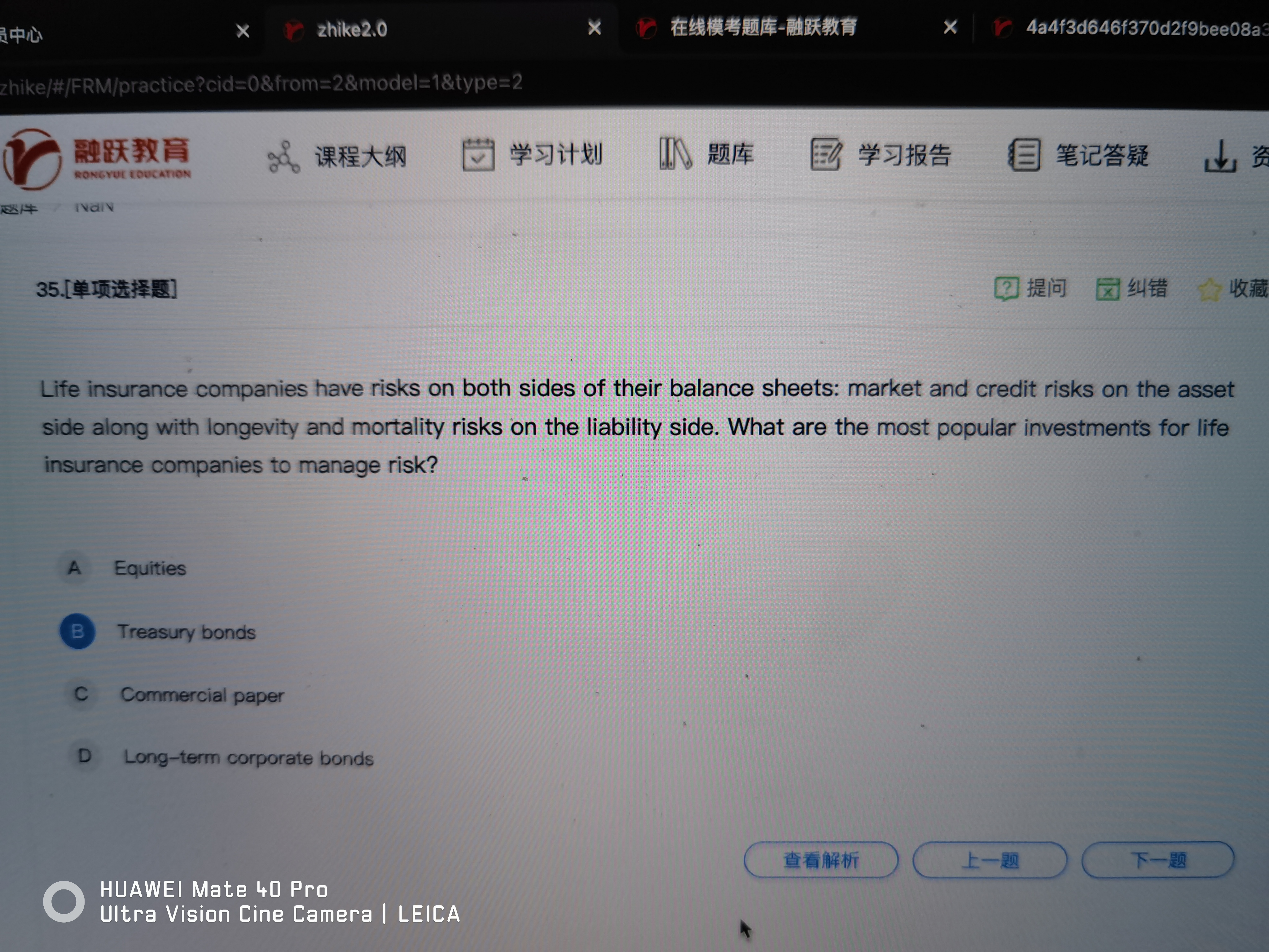 同学你好,因为虽然B选项中的treasury bonds期限也比较长(这点解析中有误,已反馈修改),但同时也是因为treasury bonds的安全性较高,收益率是要远远低于长期公司债的(长期公司债风险高收益也高),所以保险公司大部分的投资标的还是长期公司债。