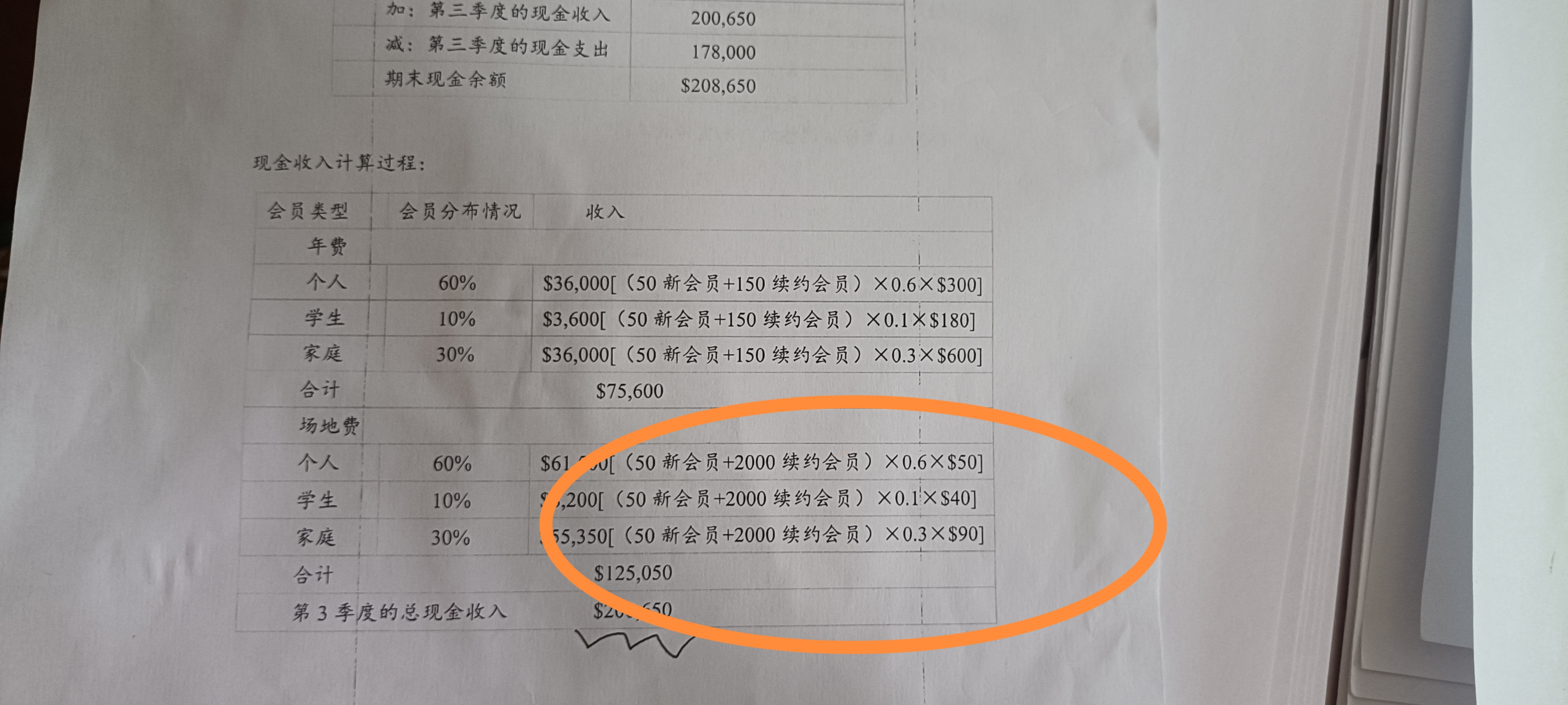 同学你好,因为问题一里面的信息:季度期初的会员人数是2000人,这2000人继续学费。同时根据“预计的会员支付活动”这个表格里面可以知道新增会员50,所以到第三季度场地会员人数=50+2000