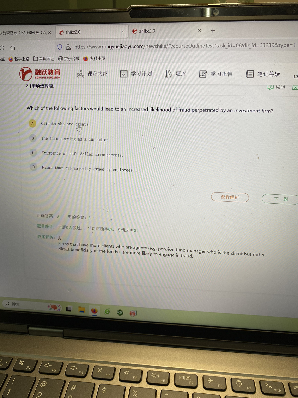 同学你好,可能导致投资经理欺诈的原因,A选项说的是投资经理和客户之间存在一个代理商,那么这个代理商和投资风险可能会为了自身的利益而进行欺诈。B选项中投资公司仅仅是作为一个托管人存在,没有什么大的利益关联,所以产生欺诈的概率比较低;软美元安排只要进行披露,产生披露的可能性是比较低的;D选项中的投资风险的股东大部分都是员工,而所有员工联合欺诈的可能性较低。