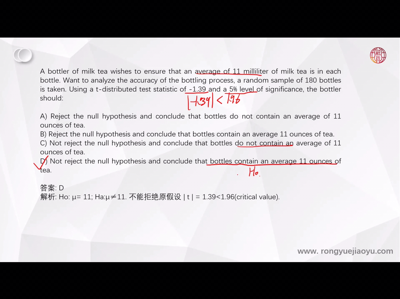 同学你好,你说的没啥问题,但是这道题,他想证明的是含量等于11,也就是说是等号,而等号我们是要放在原假设的。