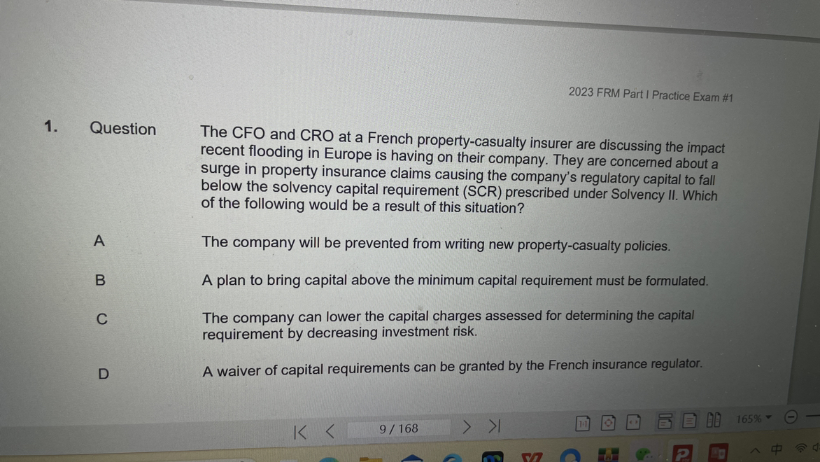 同学你好,这道题的背景知识是属于巴塞尔II关于保险公司资本金的相关规定,首先对于保险公司而言,有两个指标,第一:偿付资本金要求SCR,如果保险公司的资本金低于SCR,则要求制定一个资本恢复计划,恢复到偿付资本金以上;第二:最低资本金要求MCR,如果资本金低于MCR,则禁止开展新业务。同时MCR<SCR。 题干中说但是资本金低于SCR,所以应该采取的措施是制定一个资本恢复计划,所以A错;而且是要恢复到偿付资本以上,而不是MCR以上,所以B错;由于法国属于欧盟,所以法国保险公司的监管机构是欧盟相关机构,而不是法国的监管机构,所以D错。因为题干中描述的是一种担心,还没实际发生,所以可以通过降低投资风险来降低风险敞口,从而可以降低对应的风险资本金,因为风险敞口越大,需要计提的风险资本金就越多,所以C多对。