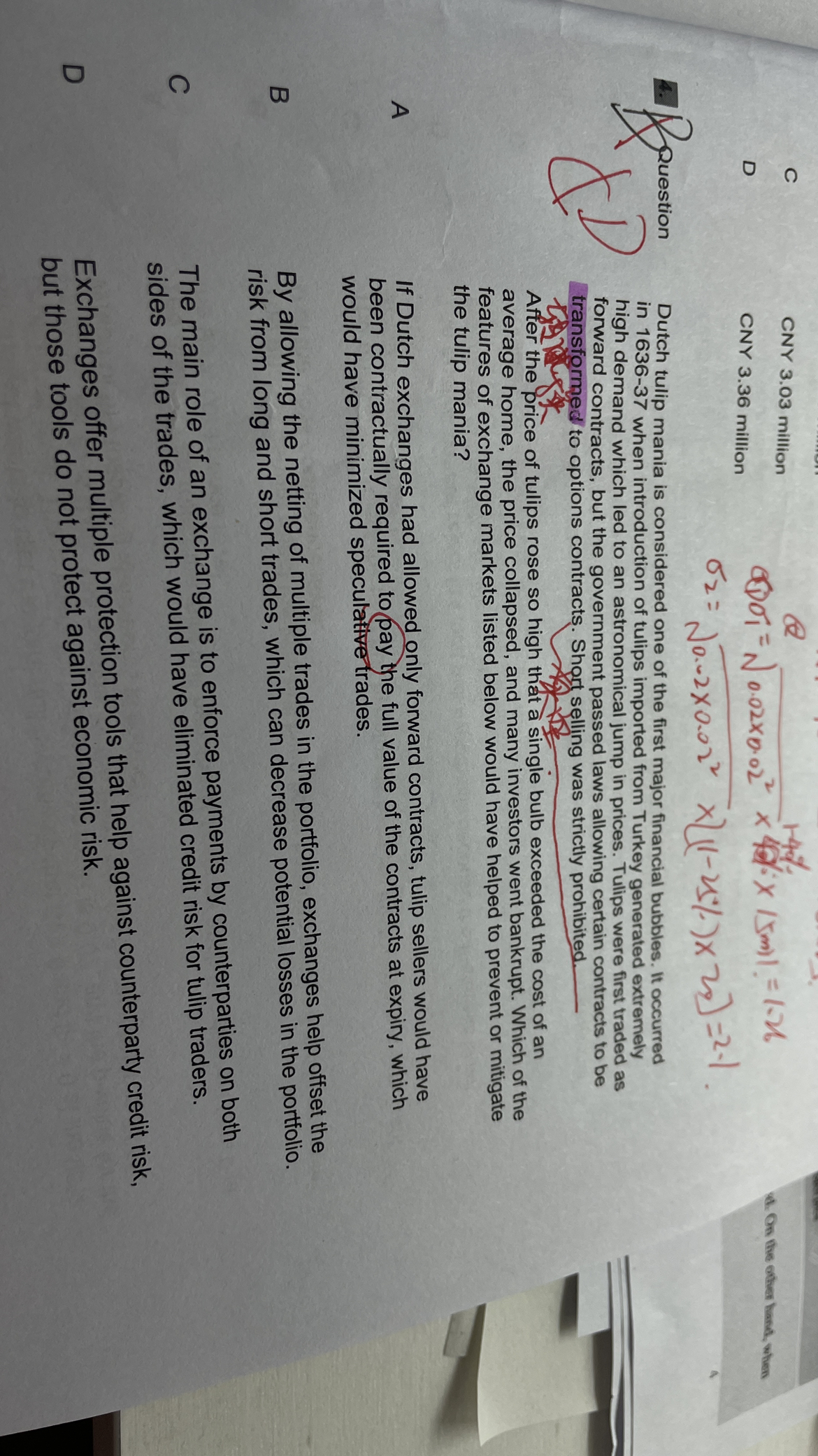 同学你好,郁金香泡沫的历史比较复杂,主要就是郁金香作为一种远期合约,但是又不允许做空,导致被大家炒上天之后,到期了买方买不起,拒绝付款,还有很多投机的,囤积了大量的郁金香,导致卖不出去。A选项错在付款方应该是买方而不是卖方;B选项错在当时已经存在交易所了,但是当时是单边市,只有卖方没有买方,同样C选项也错了;而当时没有对投资者具有保护作用的工具出现,比如CDS之类的衍生品,所以D对。
