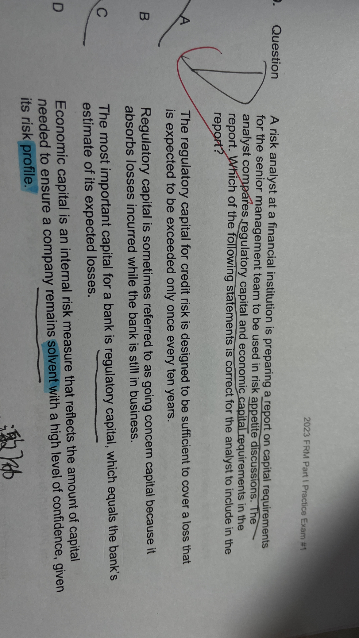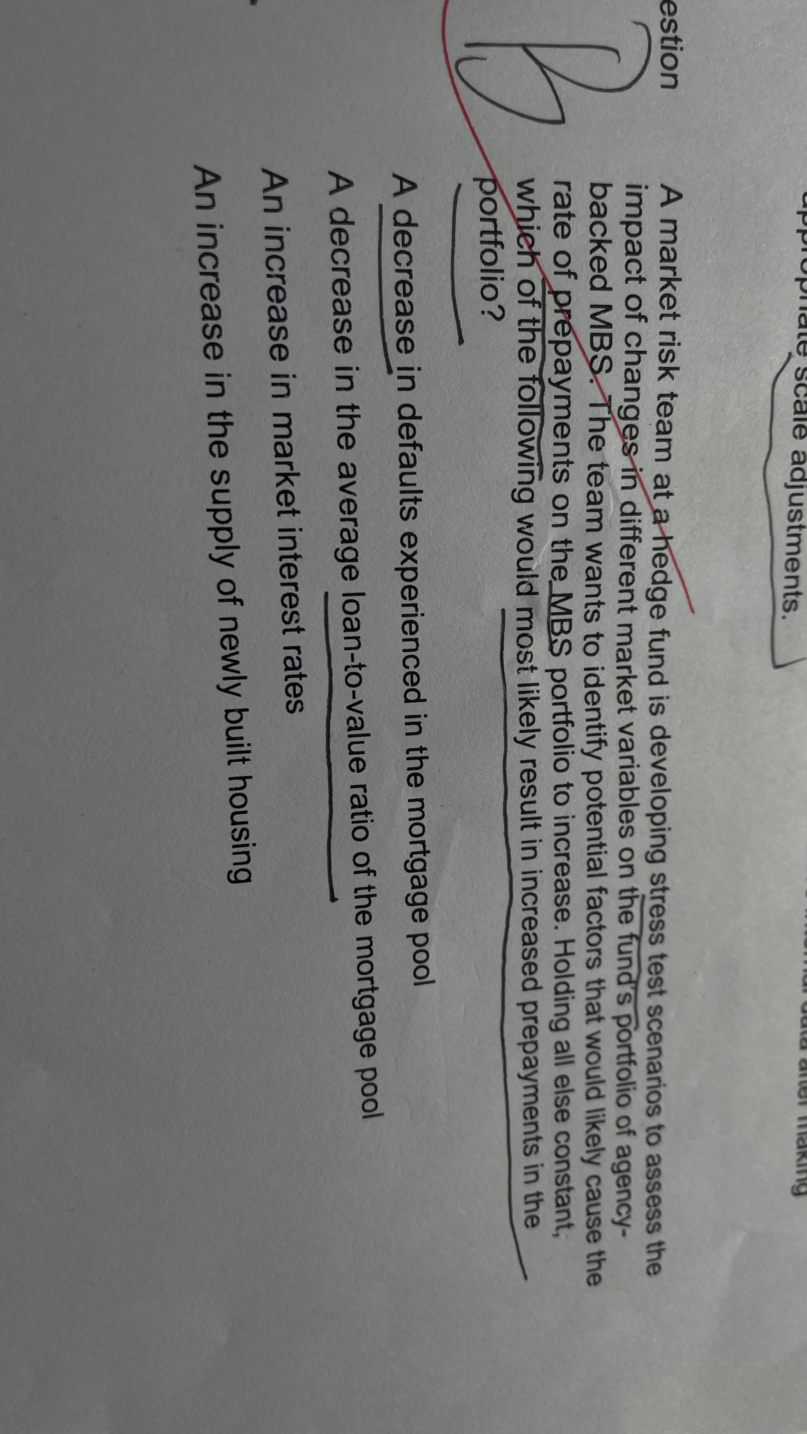 第一题的c选项很基础的概念,经济好的时候投公司债,稳定收益高,经济差的时候投国债。与此同时,衡量credit spread的风险,应该确保国债收益率不变,让公司债收益率变化,从而让credit spread变化,如果两个收益率都变,那么讨论spread duration就没意义了。第二题,关于经济资本和监管资本,在估值这门课也介绍了,经济资本是企业内部自己测量的,监管资本是监管部门要求企业留存的。第三题,mortgage的标的资产就是房贷,房贷违约,自然会对mortgage带来影响