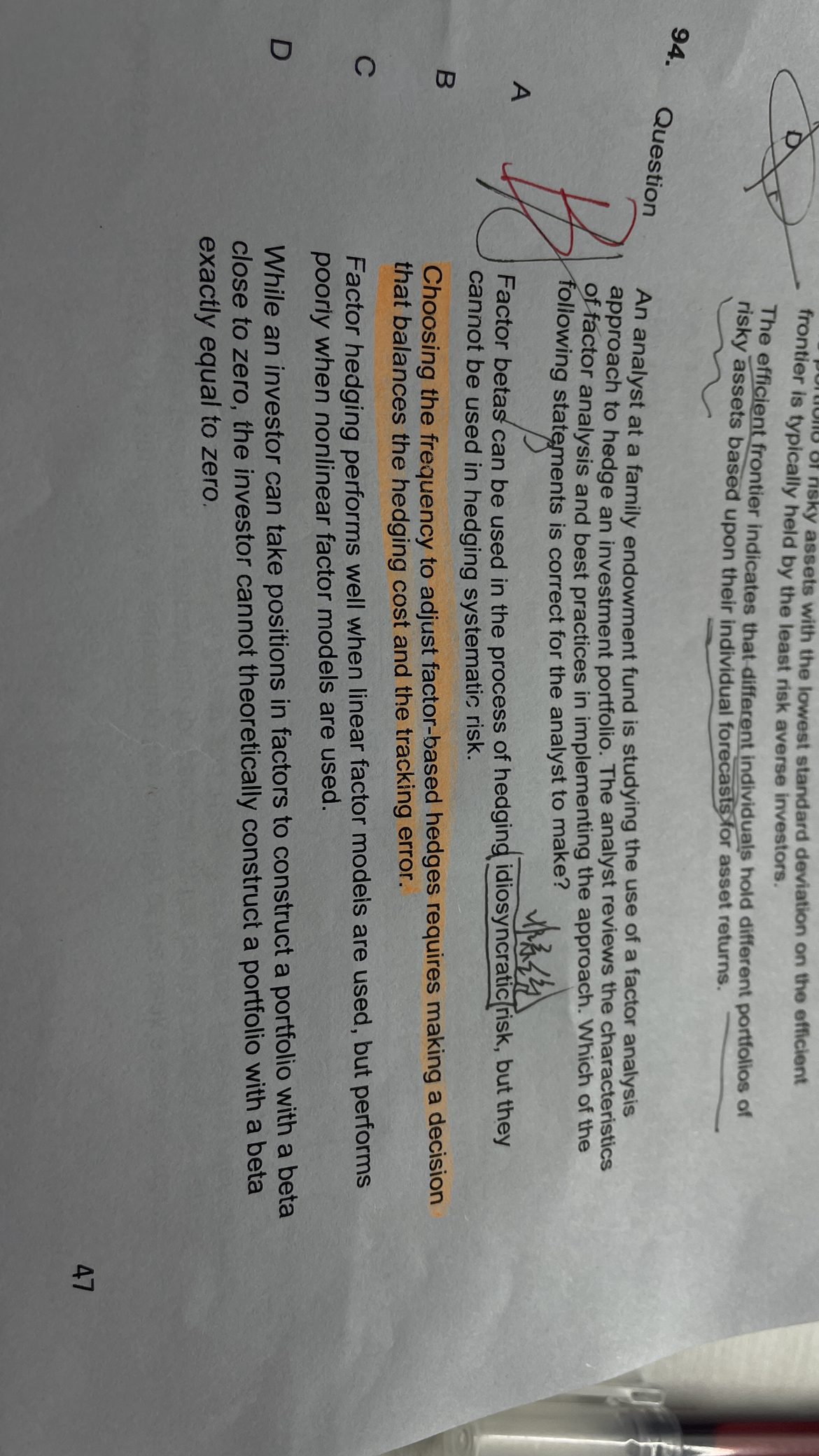 同学你好,持续的动态对冲能够降低追踪误差,但是也提高了对冲成本,所以需要在两者之间做权衡,所以B对;只要模型假设没问题,线性和非线性因子模型在对冲中都能表现的很好,所以C错;在理论上,零贝塔组合是能够存在的,在实践中可能不能完全实现,所以D错。