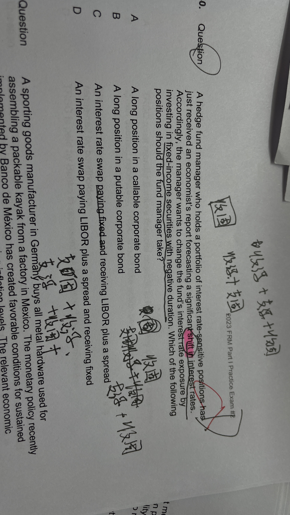 考的就是久期的基本定义。久期描述债券价格对利率变动的敏感度。久期为正,利率升,债券价格跌。久期为负,利率升,债券价格涨。