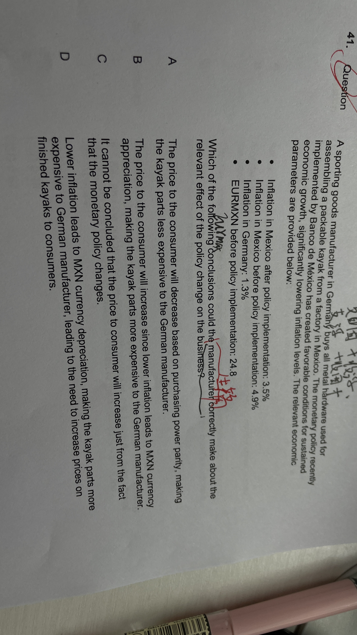 同学你好,这道题考察的其实是购买力平价利率,即在国际贸易中,利率的变化会影响汇率的变化,从而影响商品的价格。根据题干信息,墨西哥通胀率在下降,所以会导致利率发生上升,利率上升会导致汇率上升,即汇率升值,因此德国贸易商购买墨西哥商品的价格就会上升,但是这种传导机制是一个缓慢的过程而且并不是成比例的,因为商品的价格除了受到汇率因素的影响还受到其他因素的影响,这道题有点偏,结论偏实务,了解即可。
