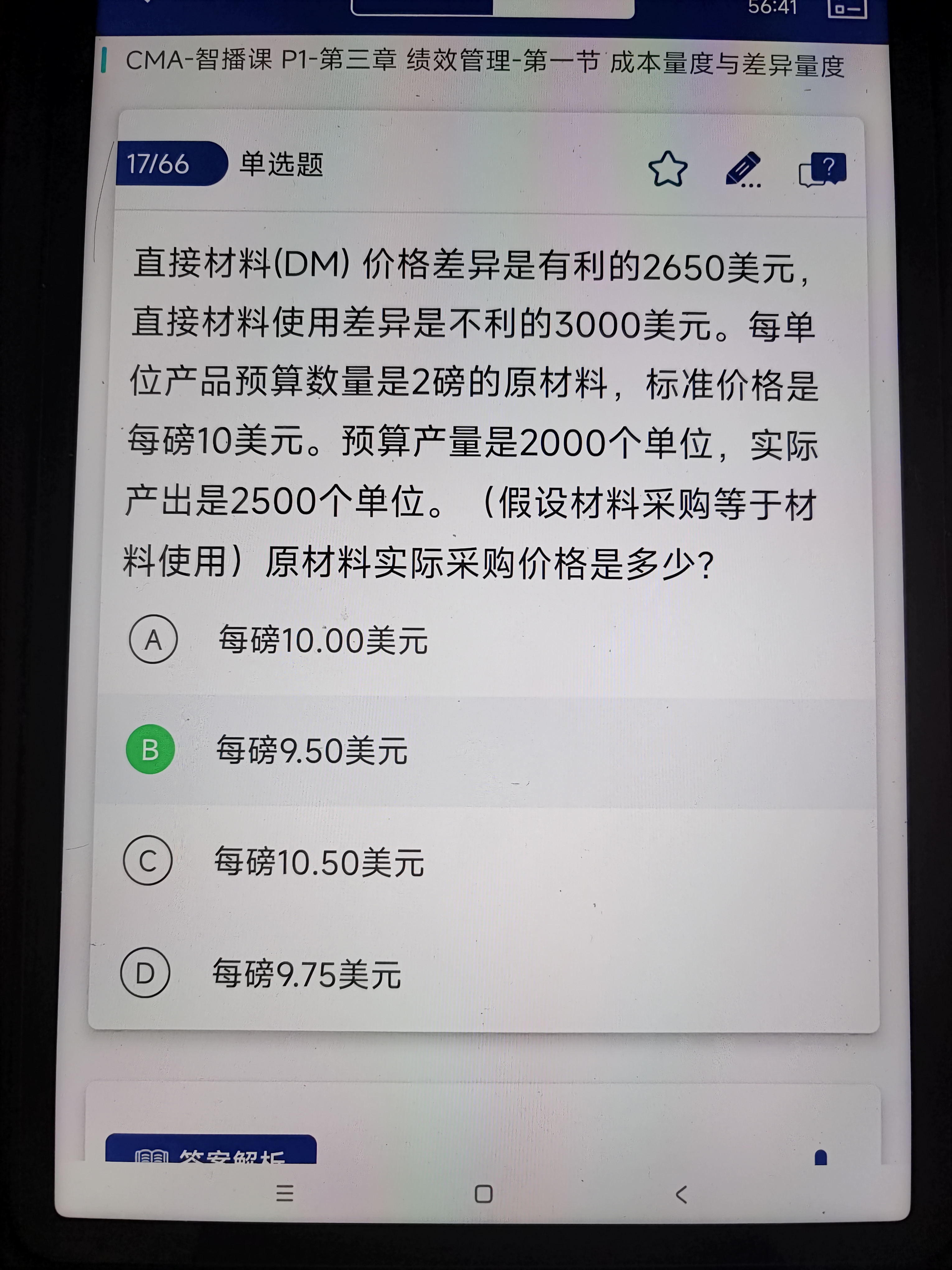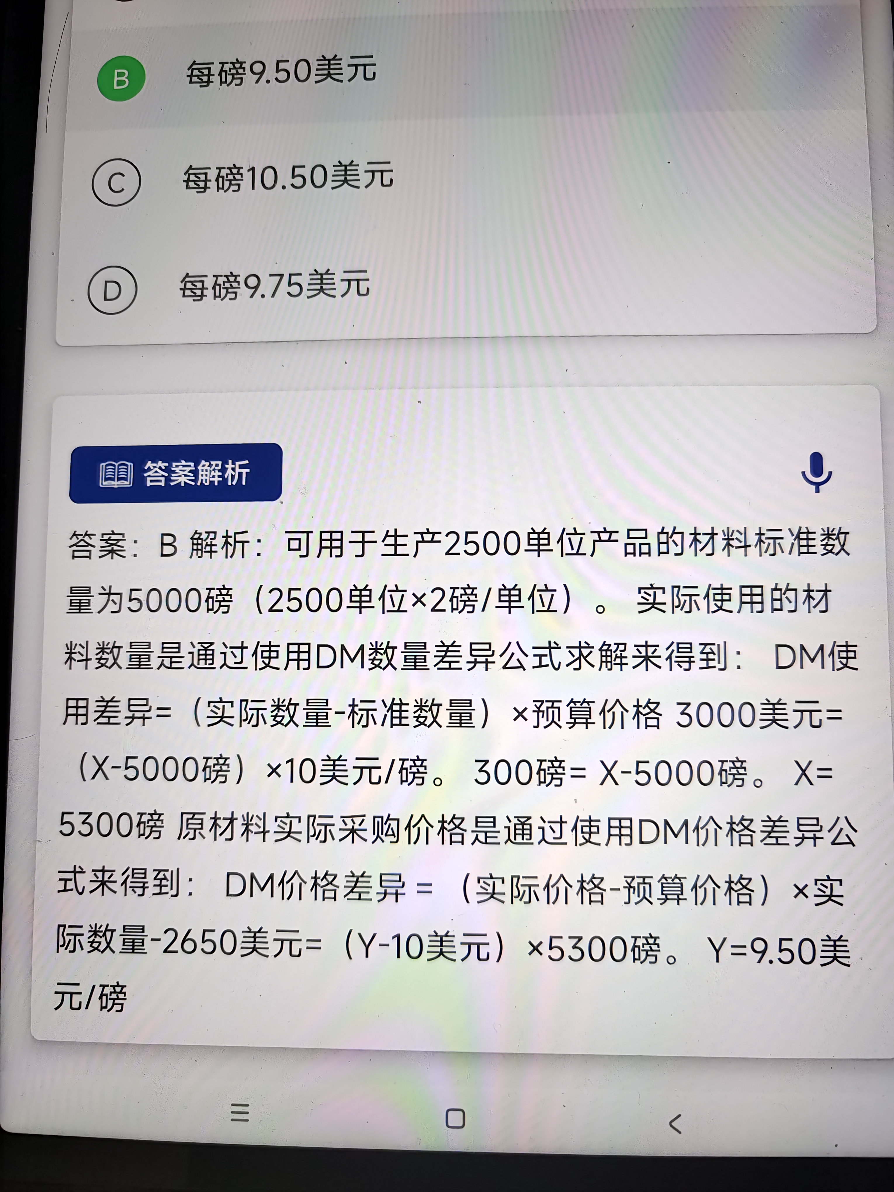同学你好,实际产出量是2500,但是不知道每单位产品实际耗用的原材料磅数。题干中给的是:每单位产品预算数量是2磅的原材料。所以需要计算实际的耗用量是多少。另外,在绩效差异分析的公式里:标准耗用量一般指的是:实际产量下的标准耗用量。标准小时数指的是:实际产量下的标准小时数。