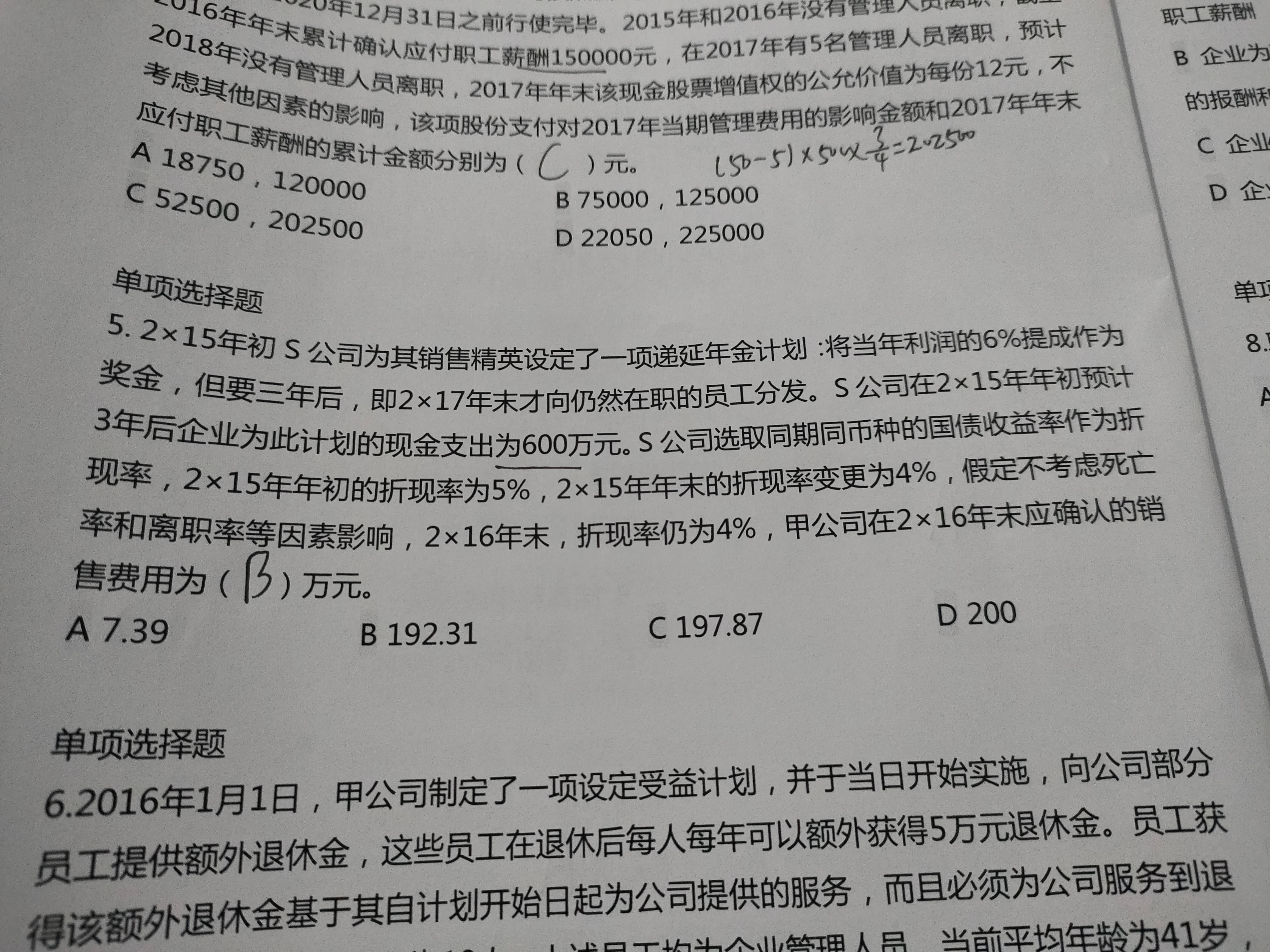 同学您好 S公司2×15年末确认的设定受益计划现值=200/(1+4%)2=184.91(万元),S公司当期服务成本=200/(1+4%)2=184.91(万元),设定受益计划净负债的利息费用=184.91×4%=7.40(万元),S公司2×16年末的会计处理为:借:销售费用 192.31 财务费用 7.40 贷:应付职工薪酬——递延奖金计划 199.71