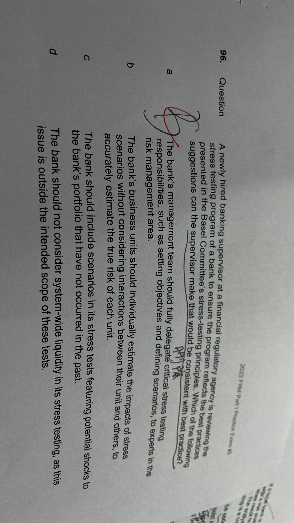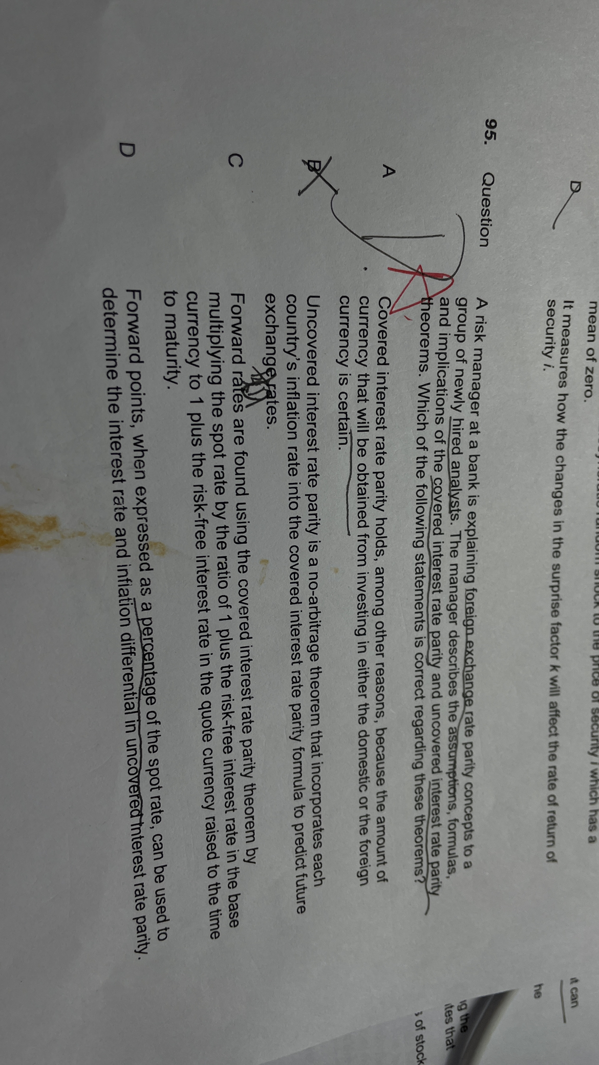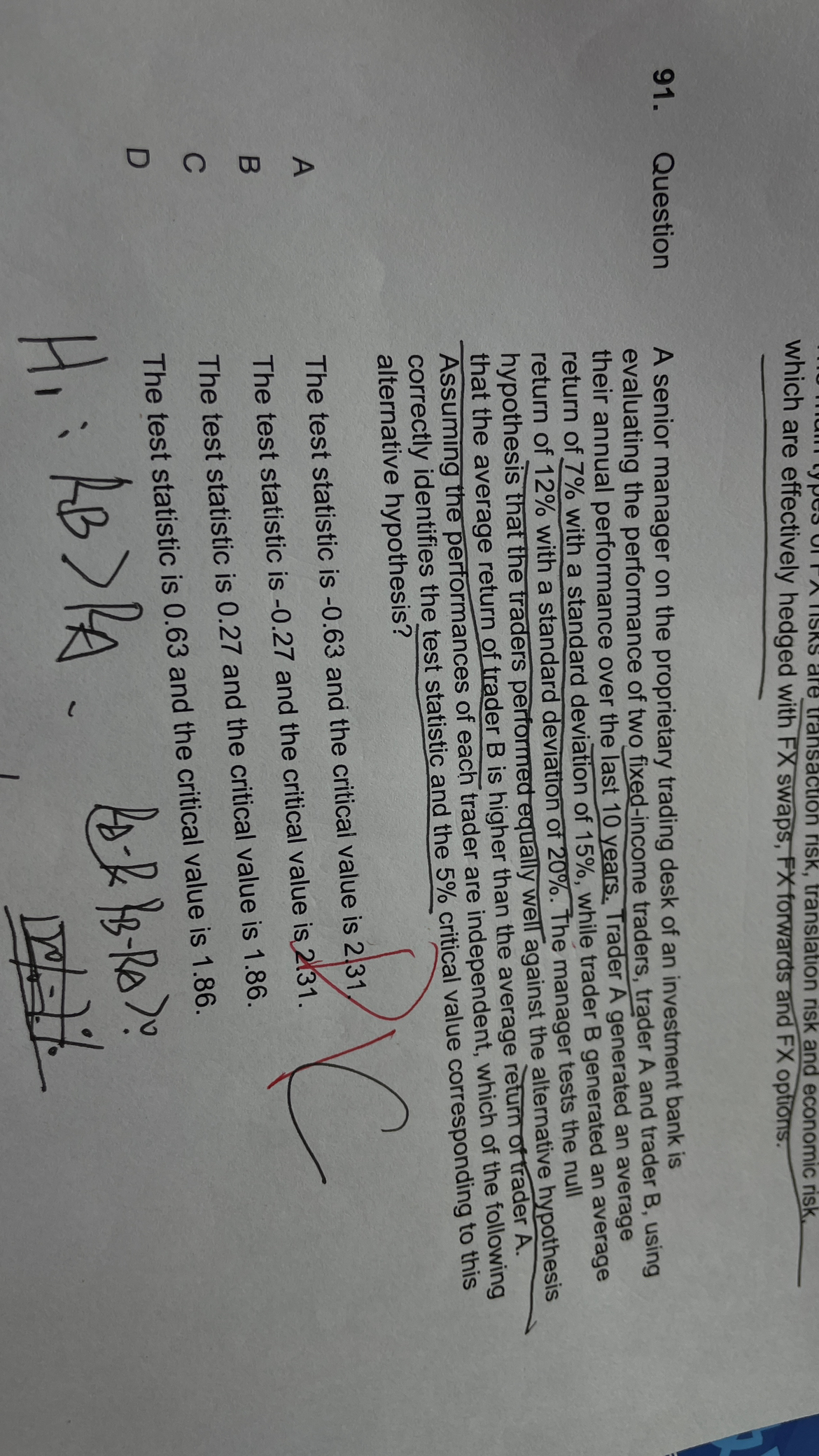 第一题,检验两个总体的均值是否相等,讲义上有检验统计量的计算公式,直接代数就能得到答案。第二题,covered interest rate parity就是FRA成立的前提,本币在本国投资相同的期限获取的收益,应该等于本币换外币,在国外投资相同期限再兑换为本币的收益。第三题如果你听得是我的课,我在课里强调过整个FRM一级关于风险管理的核心思想,推崇的ERM,反对传统风险管理,作为风险管理的成分,无论是压力测试,还是各类风险的管理,都应该遵循整个大框架,也就是ERM思想,B选项很明显是自下而上的传统风险管理