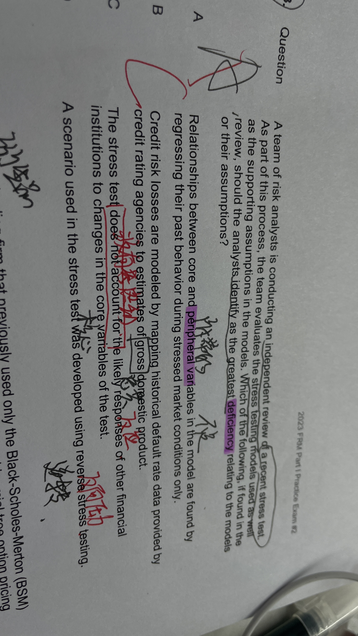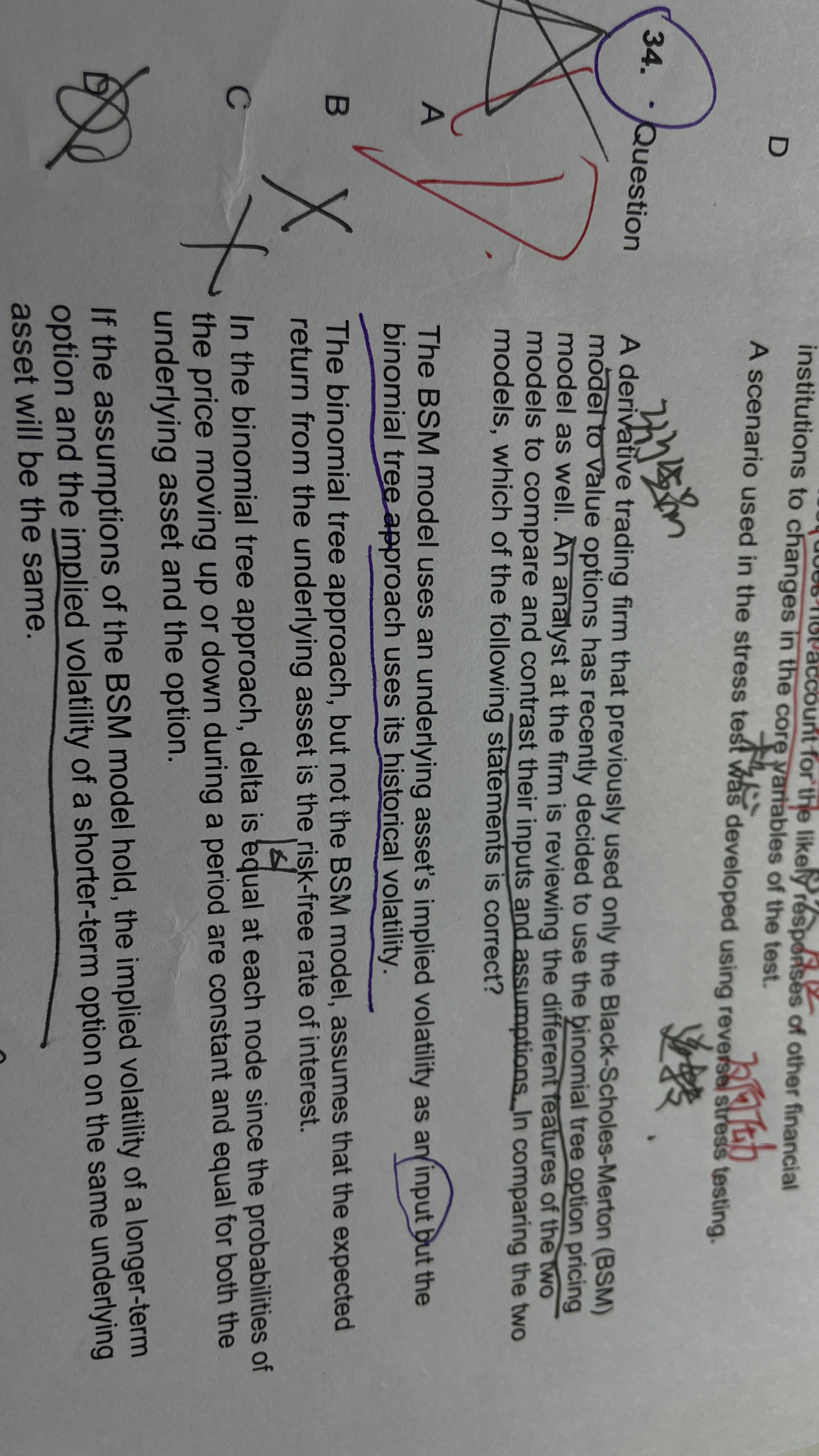第一题,我看你排除了BC,我给你讲AD,所谓的隐含波动率就是通过价格倒推的波动率,价格肯定是基于历史,未来的价格没人知道,所以无论是二叉树还是bsm,波动率都是基于历史价格计算。D选项,BSM模型的核心价设之一,波动率为常数。第二题的A选项,所谓的外设变量和核心变量进行回归,相当于自变量和因变量之间的回归,目的是寻找影响因变量的成分,以及影响程度。既然是压力测试,只考虑压力时期不考虑正常时期没有问题,但是C选项的描述就欠妥,压力测试只考虑自己机构,不考虑其他机构,课上强调过金融体系是一个链条,比如08年的次贷危机,就是一环接一环的影响导致的,所以只考虑自己,不考虑别人,并不能成为一个完整的压力测试,通常压力测试构建压力情景的时候,都会包含对于其他机构的考量