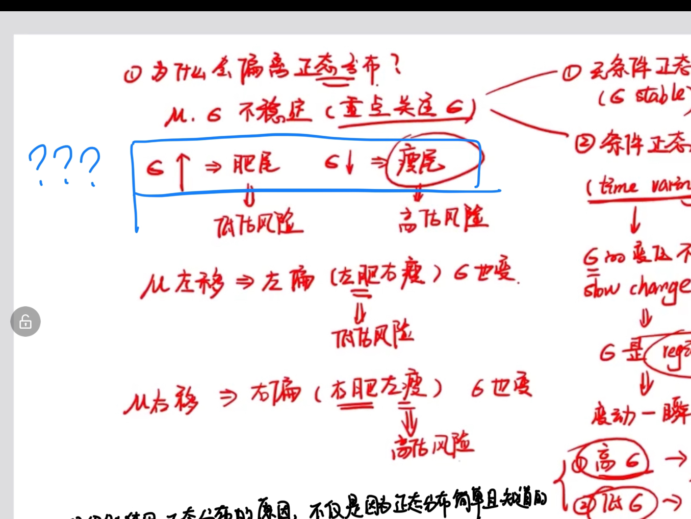 首先,肥尾分布的标准差和正态分布肯定不一样。这个我在课上具体的讲过,如果标准差随时间变化,甚至均值如果出现变化,会有什么结果,这个知识点我讲的很详细,甚至超过了考纲要求的水准,同时这个地方讲的是没问题的。这道题他考核的知识点没有你想的那么复杂。A选项,肥尾相比正态分布,标准差不同,但是均值不一定不同,这个应该没问题吧,均值确定的是分布中心趋势的位置,那么很可能有个肥尾对称分布,和正态分布的中心趋势就在一起。BCD这里面出现了一个probability mass,定量分析里面应该介绍过,所谓的probability mass function其实就是probability density function,PDF。所谓的概率密度函数,其实就是求积分,算对应区间的概率。这个明白以后,思考一下,既然尾部相比正态分布更肥,证明相比于正态分布对应的情况,极端事件发生的概率大,然而在均值附近,也就是正常状态对应的概率会偏低。B选项说,超过三个标准差,肥尾分布的概率密度更低,超过三个标准差,根据正态分布表,很明显这已经走到极端情况了,那么肥尾分布在极端情况中对应的概率应该是更高才对。B选项如果能理解,CD选项相信是可以举一反三的