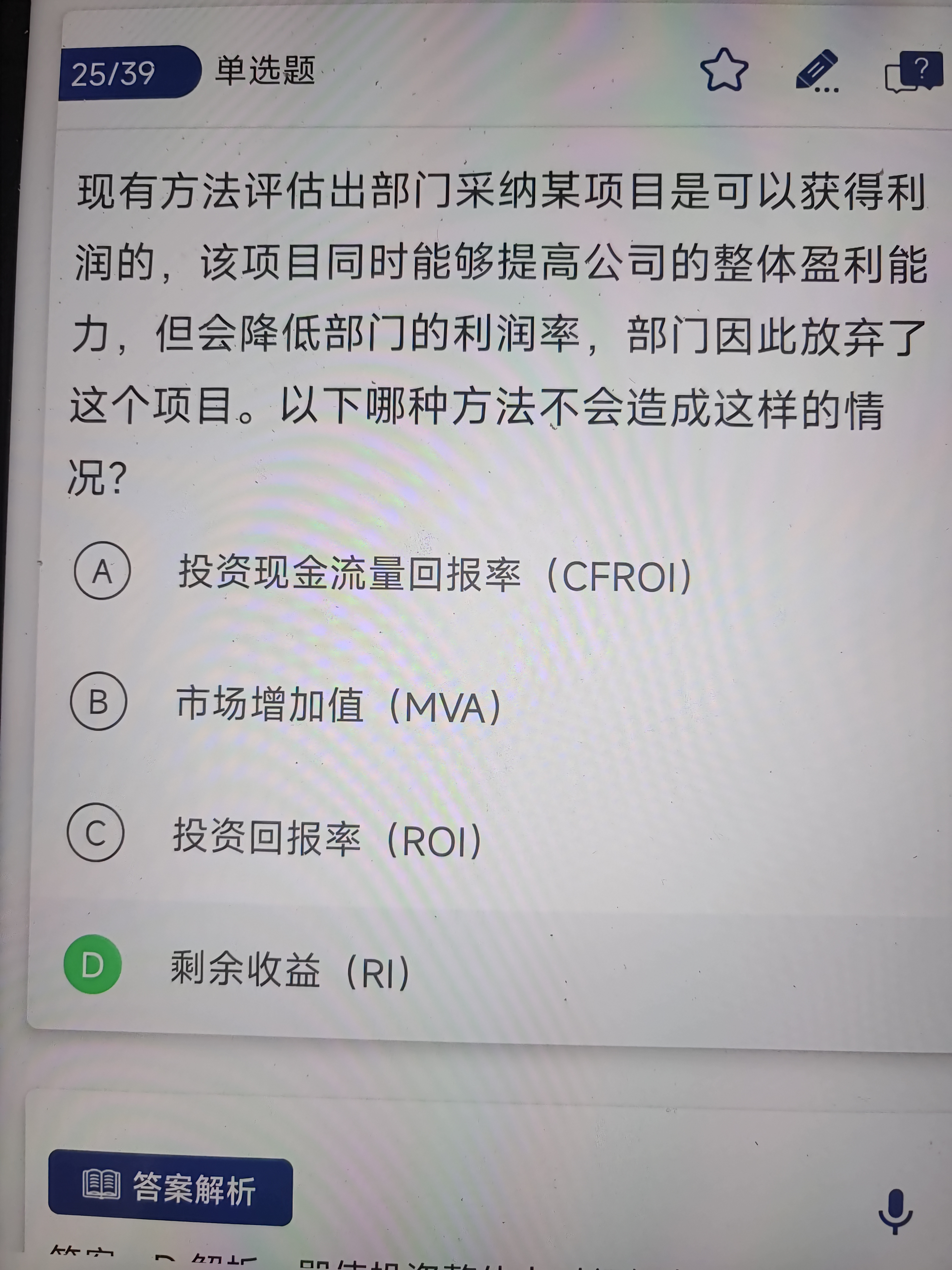 同学你好,题目问的意思是:如果某些资本投资无法保证其投资收益率等于或者好于目前的投资收益率,即便这些投资对整个组织而言在战略上是有益的,该业务部门的经理还是会可能拒绝这些投资。比如:子公司部门的投资收益率22%高于整个组织的资本成本12%,在此情况下就会发生,如果一个投资收益率为18%的新项目对整个组织是有利的,但却会被子公司拒绝。但是在剩余收益里,只要实际投资收益率大于必要报酬率都是可以选择,不会出现由于母子单位要求的报酬率不同而放弃某一项目。