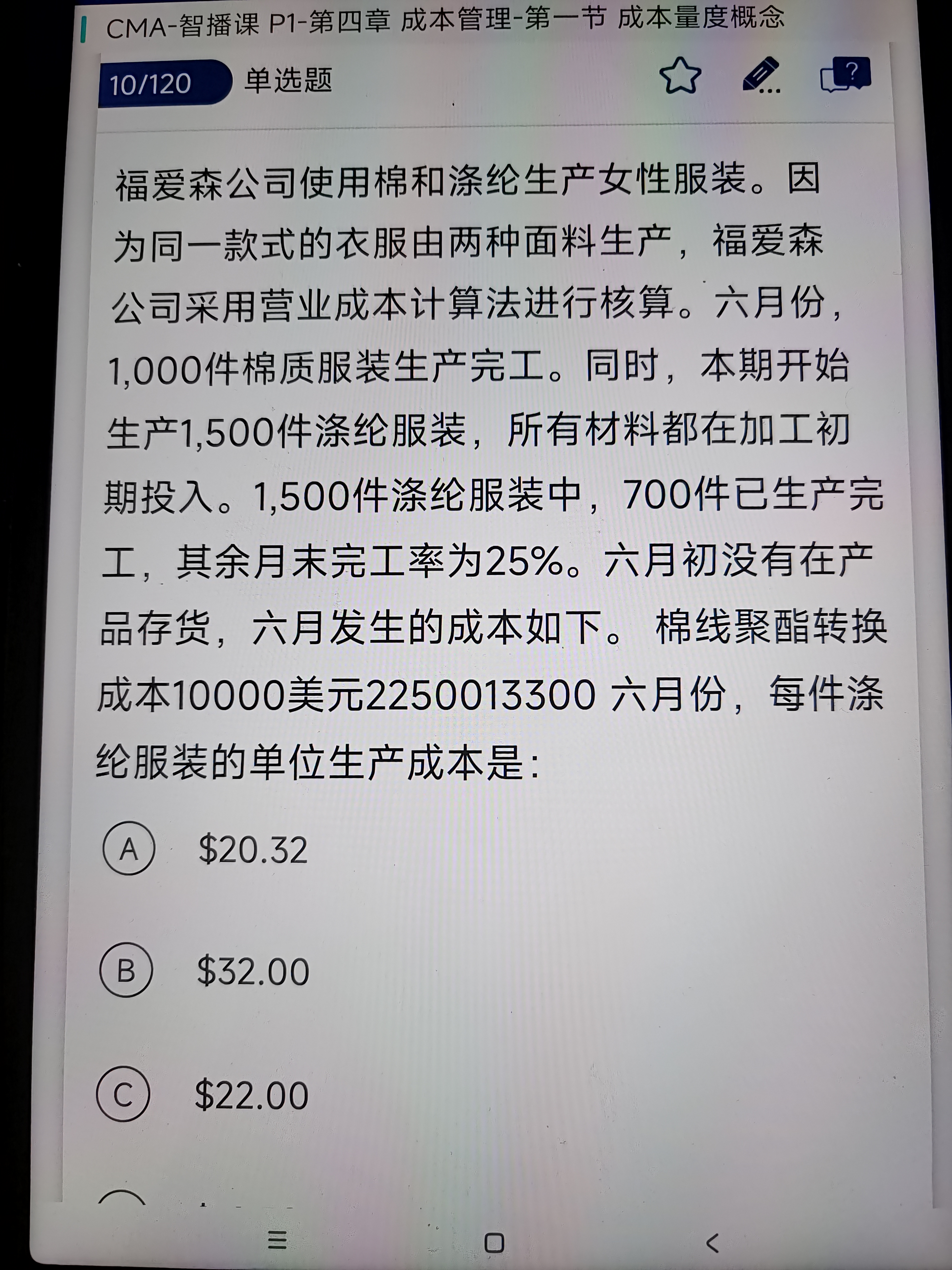 同学你好,(1)计算产品单位成本首先需要总成本与分摊的数量(2)每件涤纶服装单位成本=每件材料成本+每件转换成本。因为原材料是初期一次性投入,所以单位材料成本=相关材料总成本/总数量=22500/1500=15(3)计算转换成本的时候,因为转换成本是棉服、涤纶共有的,所以需要在两种产品中分摊。转换产品总成本题目中已经提供是13300,接下来我们能需要计算数量。首先六月份期初无在产品,棉服本期投入并生产的数量=1000。涤纶本期投入生产1500,其中700件已完工,800件完工25%,所以涤纶的约当产量=700+800×25%=900。所以转换成本的单位成本=13300/(1000+900)=7。所以涤纶的单位成本=单位直接材料成本+单位转换成本=15+7=22