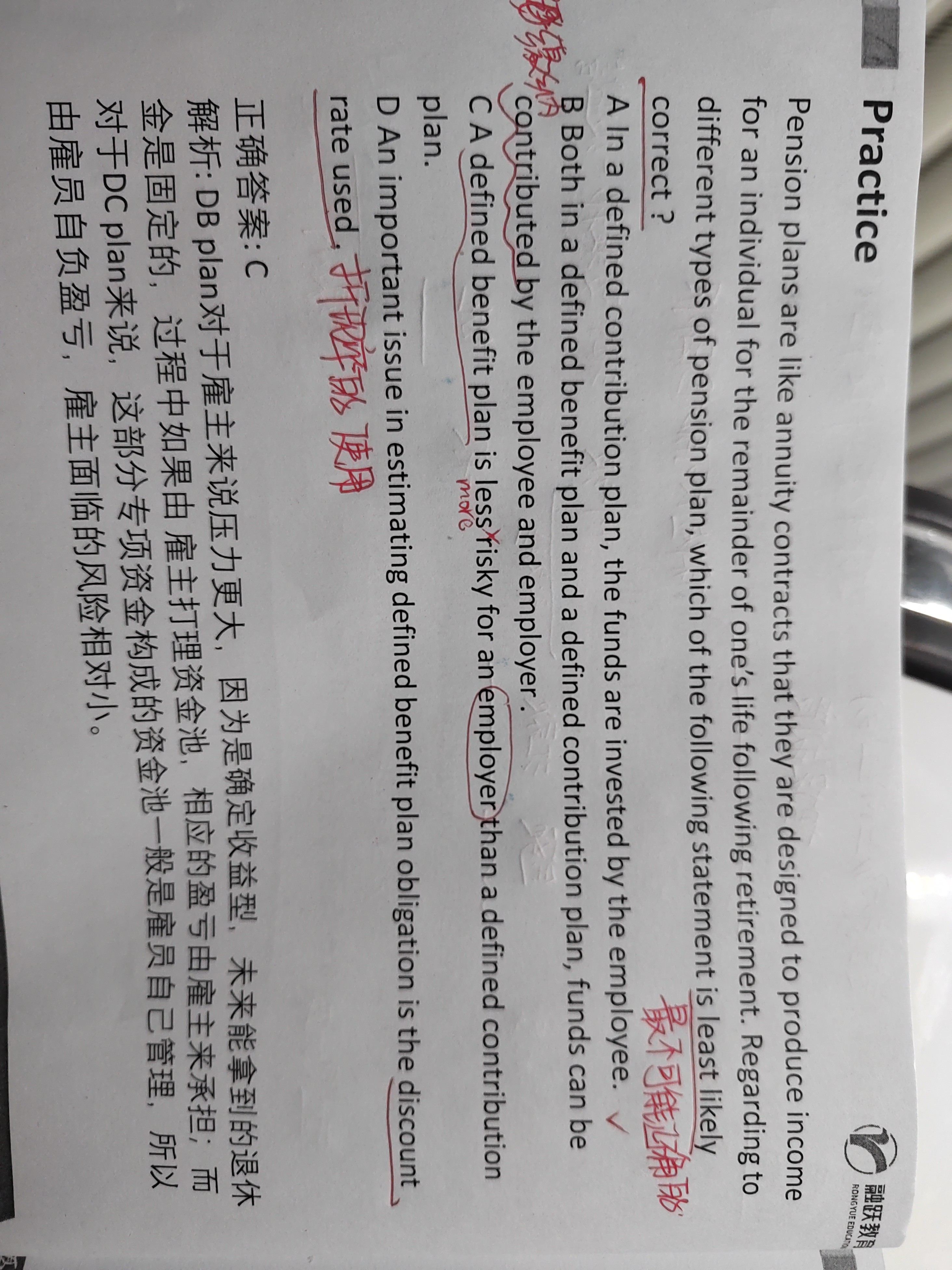 同学你好,DB plan类似于一个固收产品,未来要支付给员工的养老金金额是固定的,对于企业而言,最大的风险就是利率的变动。