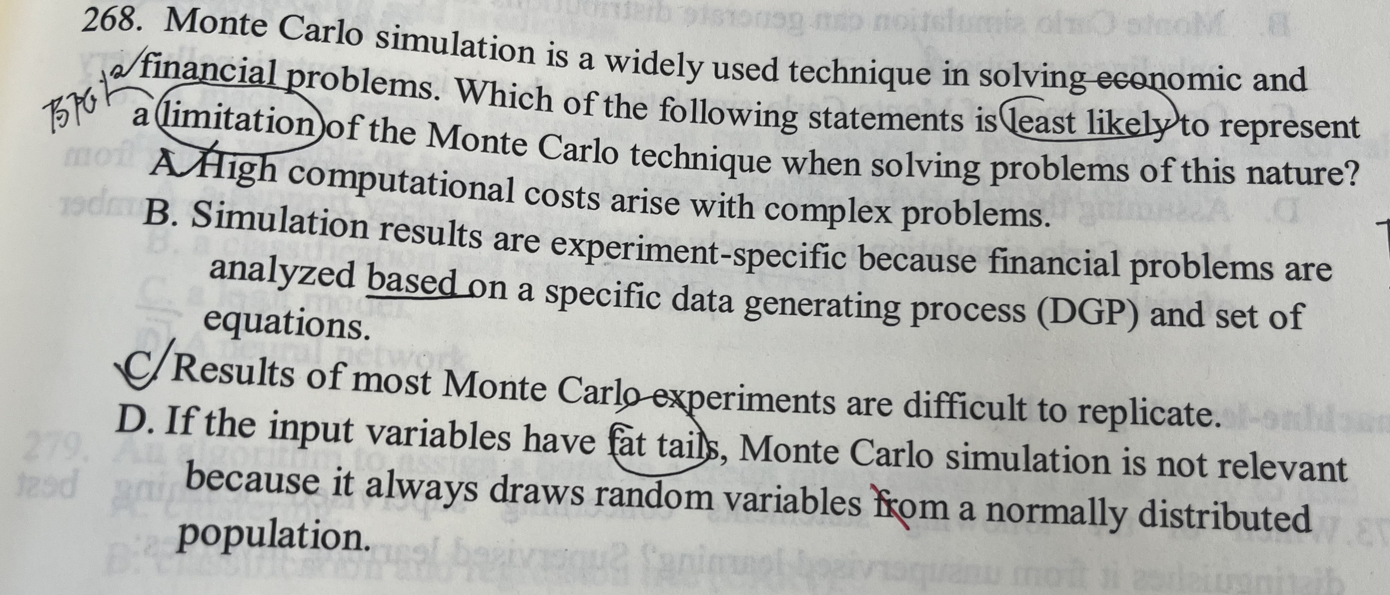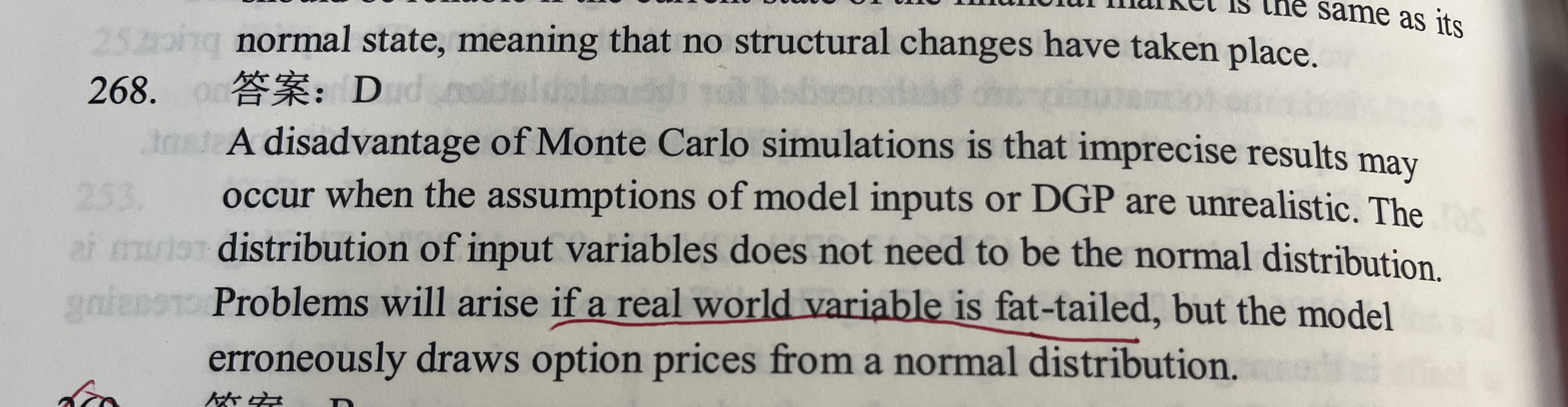 蒙特卡洛模式是先去假设一个分布,然后从分布里面抽取随机数,进行路径的预测。没有说一定要假设是服从正态分布的。答案的意思就是想告诉你,比如我现在要估计期权的价格,明明期权是服从肥尾分布,结果你现在非要假设期权服从的是正态分布,从正态分布里面抽取随机数进行预测,那结果肯定是有问题的。所以还是强调,蒙特卡洛模拟只是要求服从某一个分布,没说非要服从正态分布。