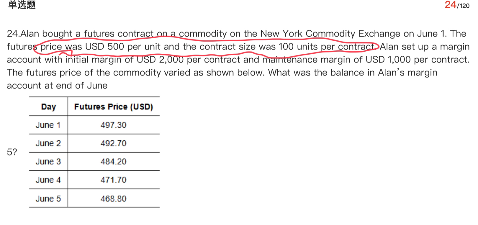 同学你好,划线句子的意思是一份期货合约的数量是100个,一个的价格是500.(类似于股票中的一手=100份股票,一份股票的价格是500)。buy future指的就是买入期货合约的意思。你这个题目在线上题库-金融市场产品科目-Unit 11. Futures,、forwards,、swaps中有,复制题干部分信息然后用ctrl+F搜索,就可以找到,你看下视频解析就懂了https://video.rycfa.com/sv/5ee01e21-176a8701a5b/5ee01e21-176a8701a5b.mp4