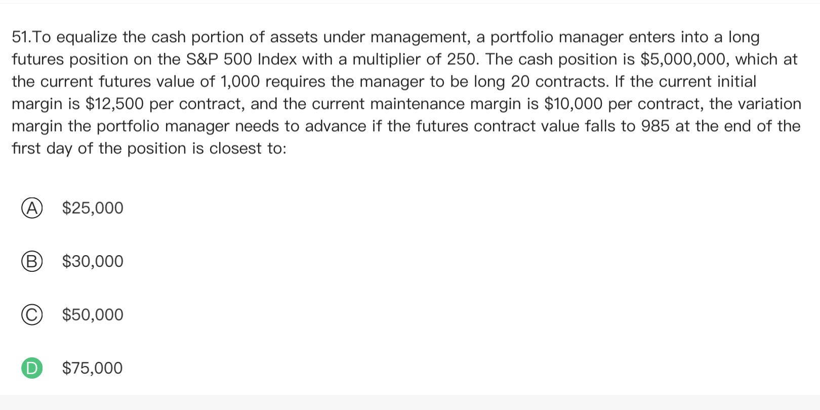 题干没有说cash position到底是什么资产,不过从用标普500指数多头去对冲可以看出,这个cash position应该就是美元存款,你可以这样理解,该投资经理预期利率会下降从而导致其存款收益下降,但是,利率下降又会导致股市上涨(标普500指数上涨),所以为了对冲这个利率下降的风险,可以通过做多标普500指数期货进行对冲。