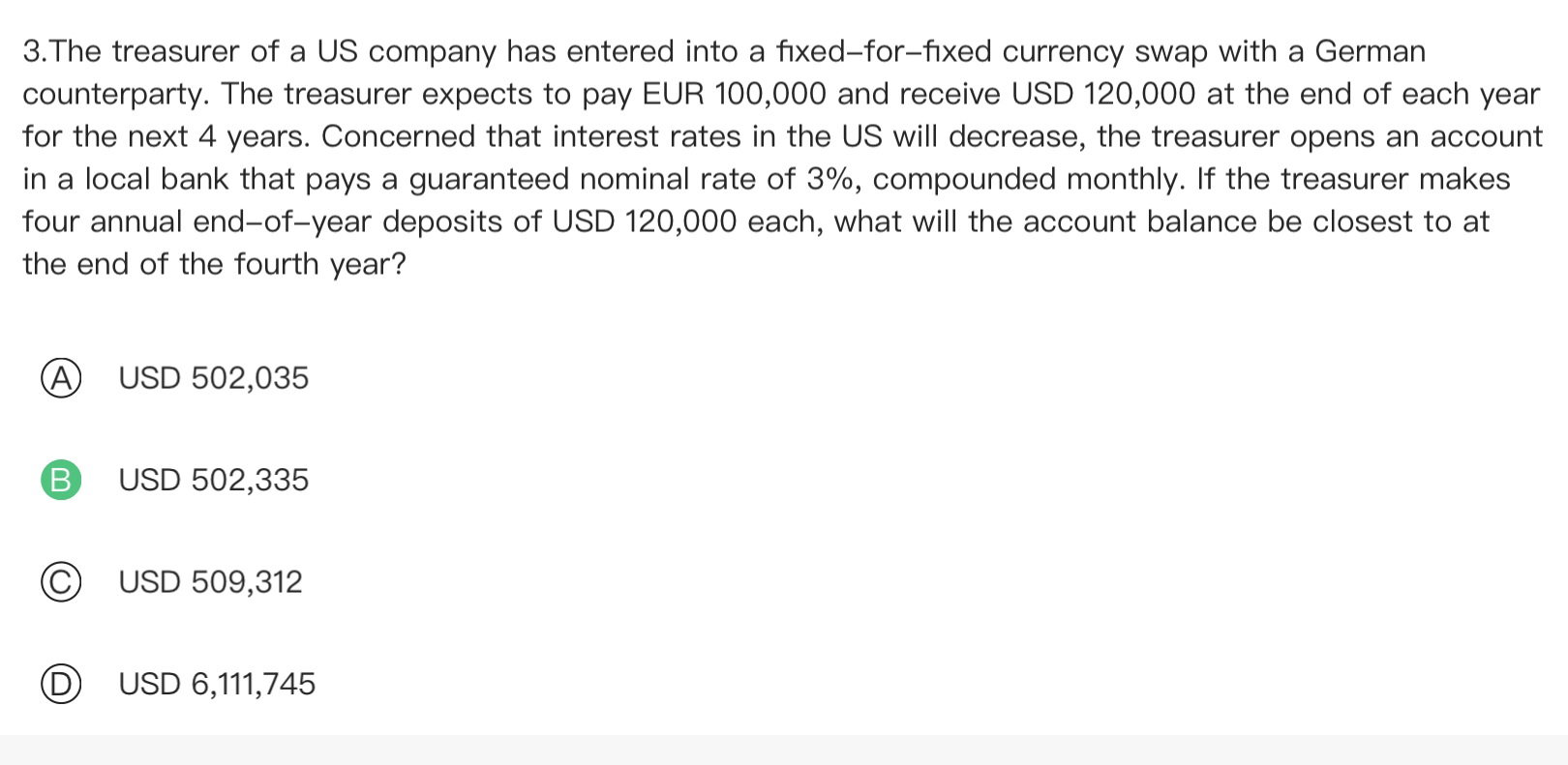 这是题干背景信息(进入货币互换,支付欧元收到美元,然后利用每期收到的美元存入银行,4年后一共能收到多少本金和利息),目的是引出当下的月度复利方式下的月利率,为后面计算年年利率做铺垫。关于货币互换内容在第三门科目有讲。