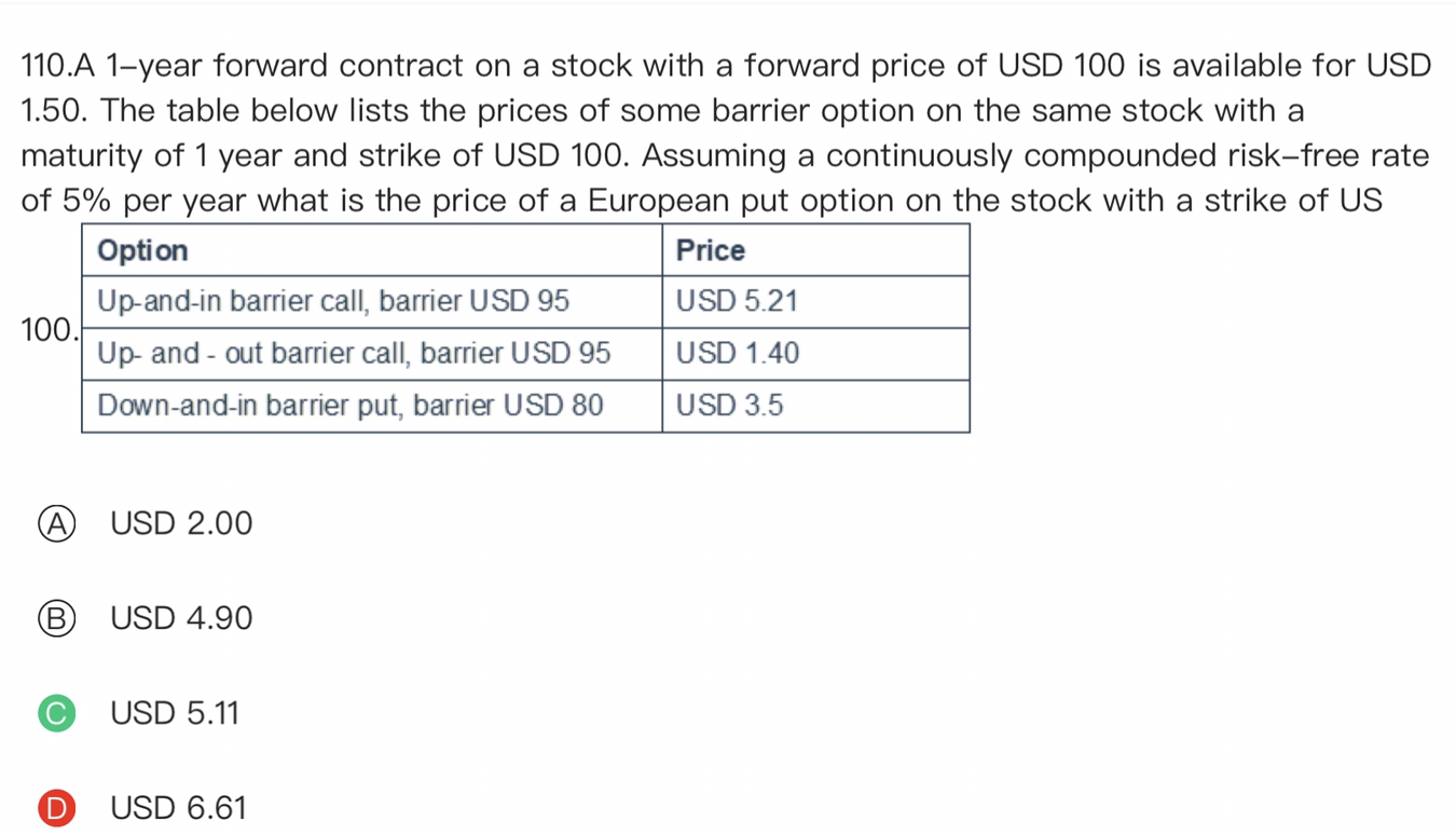 同学你好,这道题比较综合,首先你要知道Up-and-in barrier call 和Up-and-out barrier call之和就是欧式看涨期权(5.21+1.4=6.61),然后第二远期合约的价值计算公式:V=S0—Ke^-rt = 1.5,然后根据期权平价公式计算出看跌期权的价值,P=C+Ke^-rt—S,计算出P=5.11,另外提醒一下,很多题目都有视频解析,你在题库里面搜一下题干信息就可以找到,视频解析中老师讲的很清楚的。