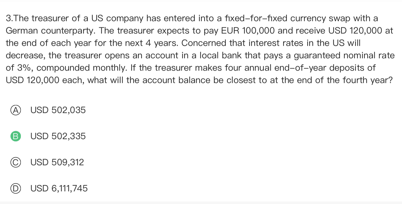 同学你好,这道题让计算的是每年年末存12万,四年后存款账户里面的本息和总共有多少钱,题干前半部分是一个货币互换的背景,属于干扰信息,有用的信息只有一个,就是银行给的月度复利的利率是2%,然后转换成年化利率(即 I/Y=3.04),再通过金融计算器知四求一计算出FV(N=4,I/Y, PV=0,PMT=120000)。
