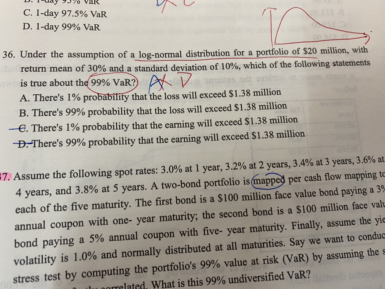 同学你好,VaR一般是用来衡量损失的,其实这个只是习惯,并不准确,准确来说就用来衡量左尾某个分位点的对应的数值,在这道题里面,由于背景分布是对数正态分布,所以左尾也都是正数,所以对应的就不是损失,而是盈利,当然这种情况不多见,因为对数正态分布常用来衡量价格分布(不能为负数),而不是收益率,当然,金融里面用的最多的是还是收益率分布(即正态分布,可以为负数),所以题干这种背景情况不多见。