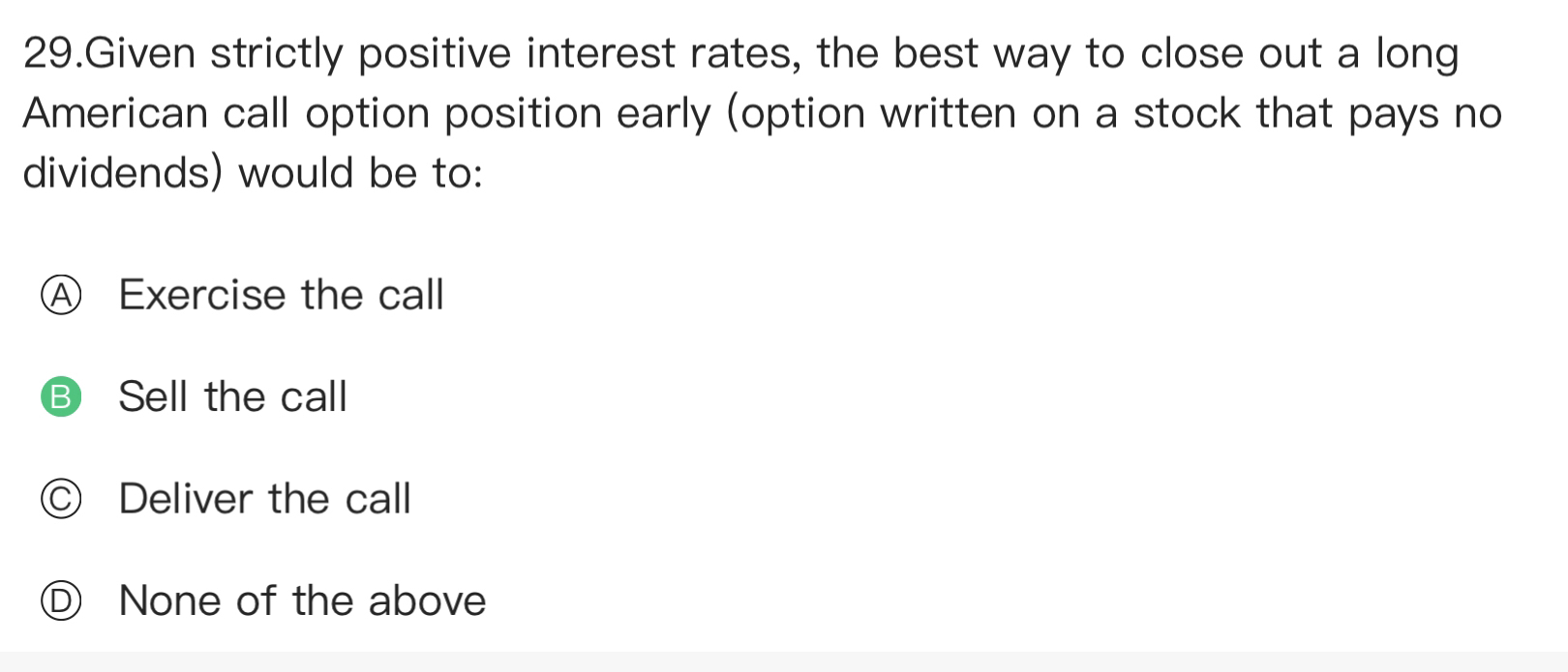同学你好,这道题问的是如何把一个长期的美式看涨期权进行快速平仓(在利率为正且卖出一份期权时没有分红),当然直接卖掉,一来不用考虑分红的事情,二来因为利率为正提前卖掉可以把钱存银行吃利息。因为行权的话还要看是否是处于价内,如果不是直接行权会产生亏损。