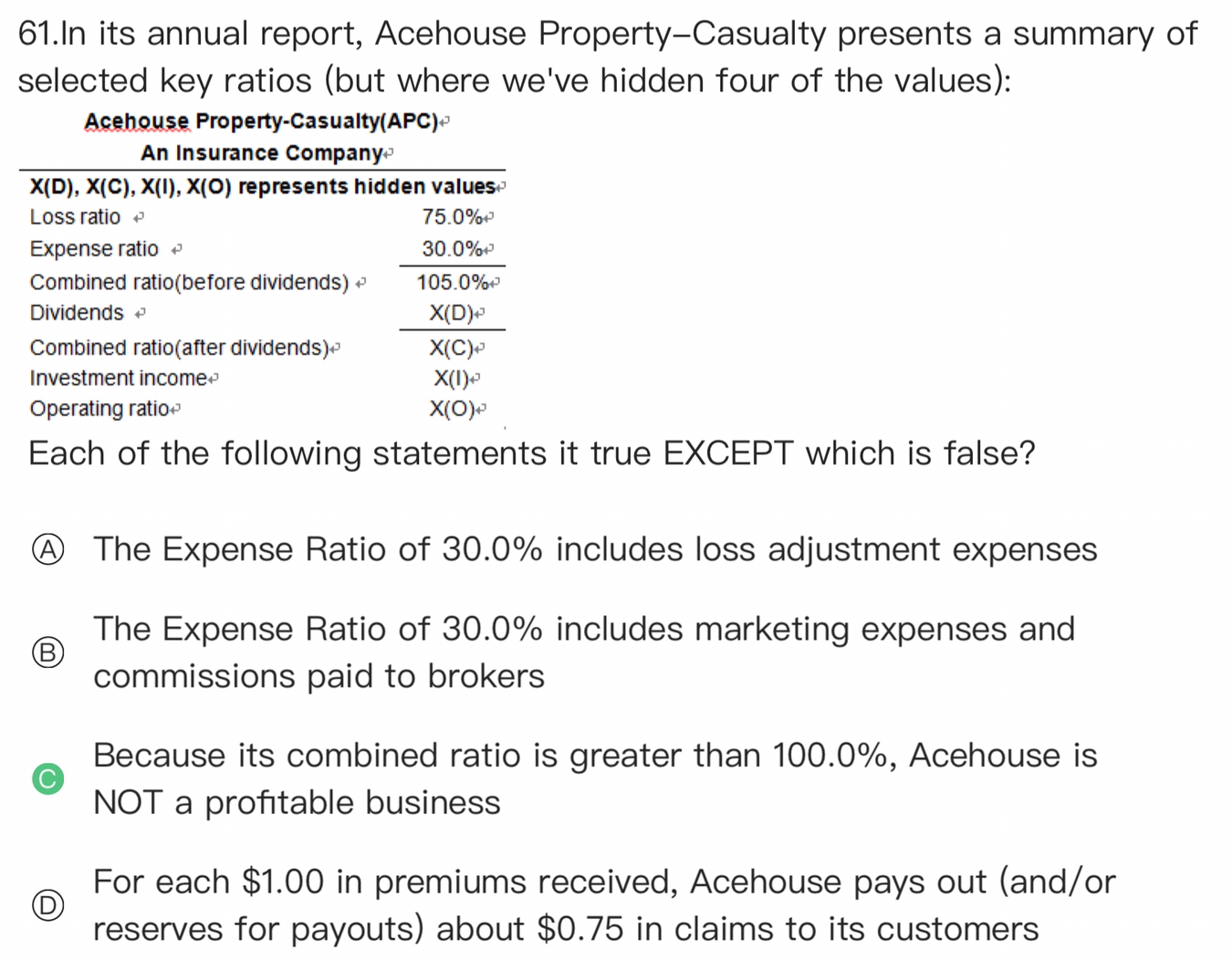 同学你好,combined ratio仅仅是损失率和费用率之和,大于100%属于正常情况,因为保险公司的净利润是运营比率=combined ratio + dividends - 投资收益率。 A选项中的费用率包括损失调整费用和销售费用(销售佣金),所以A和B对 D选项描述的就是损失率,所以D对。