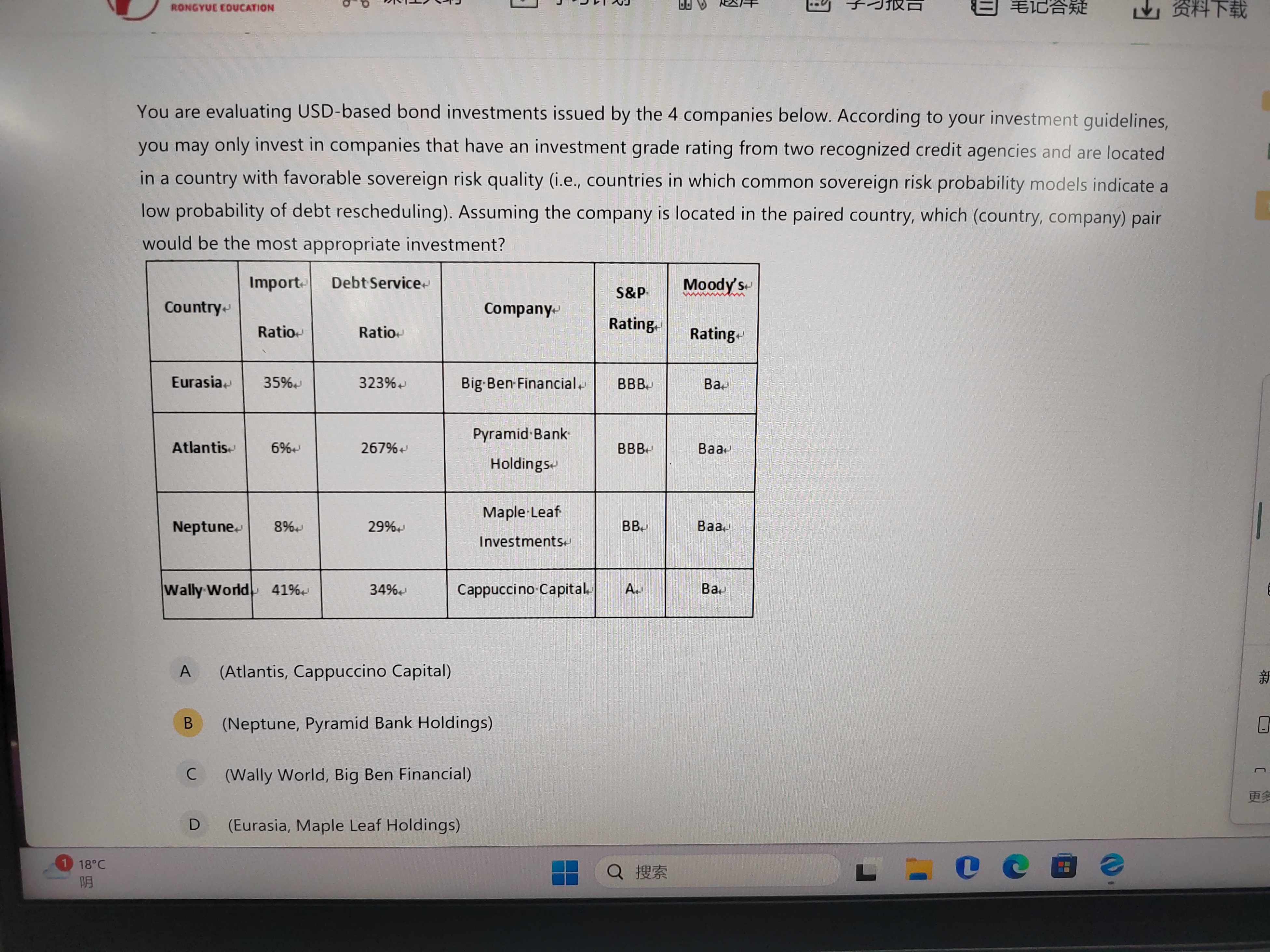 同学你好,公司信用风险看评级,BBB级以上的都属于投资级别,风险较低,只有Pyramid Bank Holdings符合;国家风险看进口率和外债偿还率,进口比率越高,意味着对外汇的需求越大,外债偿还率越高意味着对外汇的需求越大,一旦外汇不足极易发生主权信用风险,综合两个指标来看,只有Neptune的这两个指标相对较小。