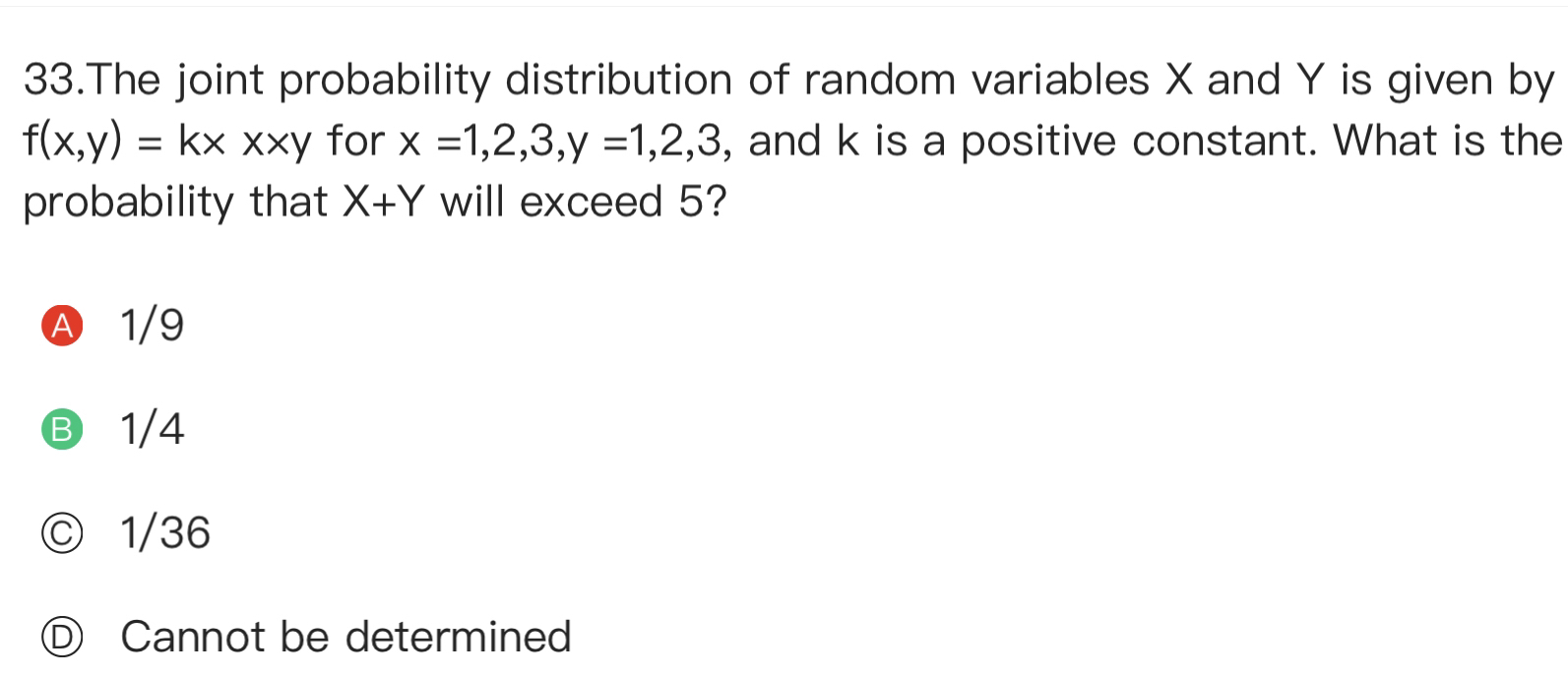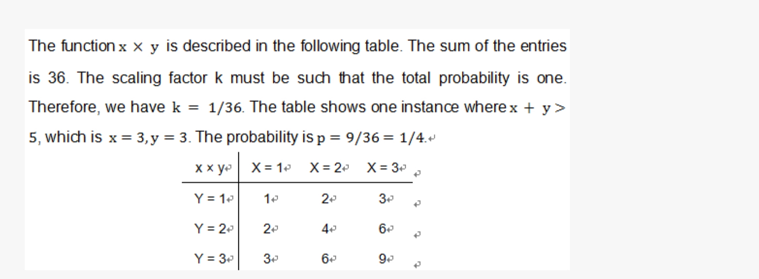 同学你好,首先,这道题要求的是X+Y>5在联合概率密度函数中函数f(X,Y)=k*X*Y中的概率,计算概率首先要知道该函数的无条件概率即分母是多少,根据答案中的概率矩阵可知,有九种可能性之和应该为1,即36k等于1,则k=1/36,而当X=3,Y=3时,f(x,y)=9k,全概率为36k,此时所求概率即为9k/36k=1/4.