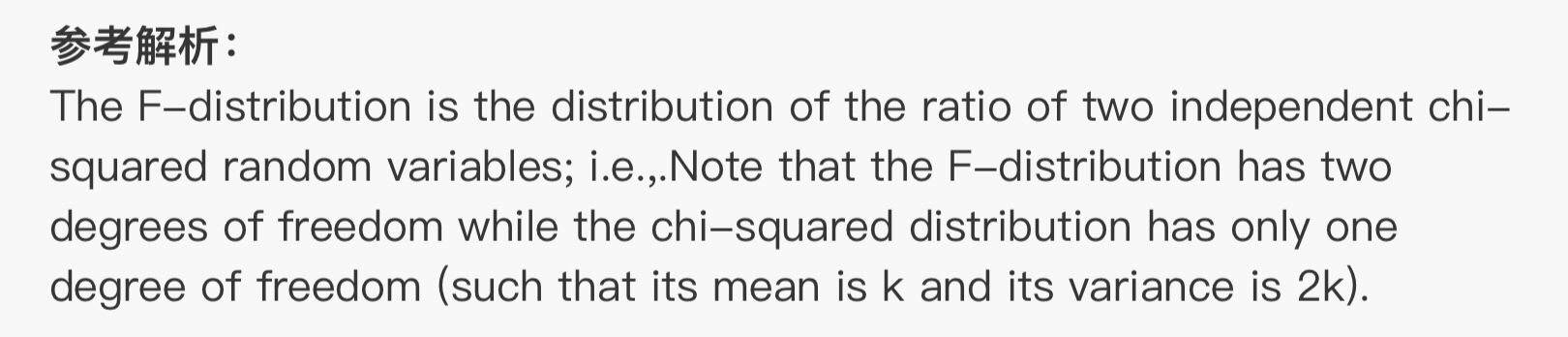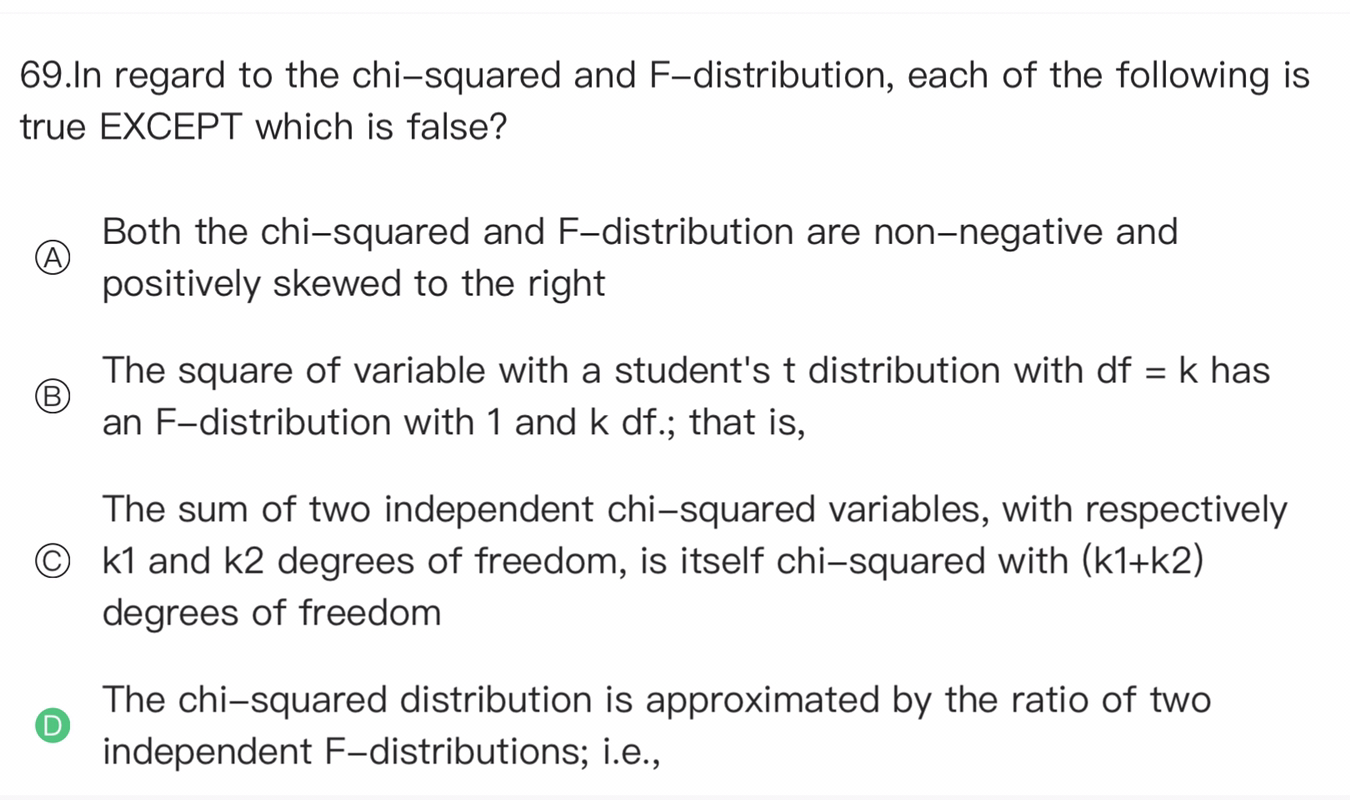 同学你好,t分布(自由度为k)的平方服从一个自由度为(1,k)的F分布,所以B对,这个知识点有点朝纲,了解即可;两个独立的卡方分布(自由度是K1,K2)之和仍然服从一个卡方分布(自由度是k1+k2),所以C对,这个知识点也有点朝纲;两个独立的卡方分布相除就是F分布,D选项说反了,所以错。