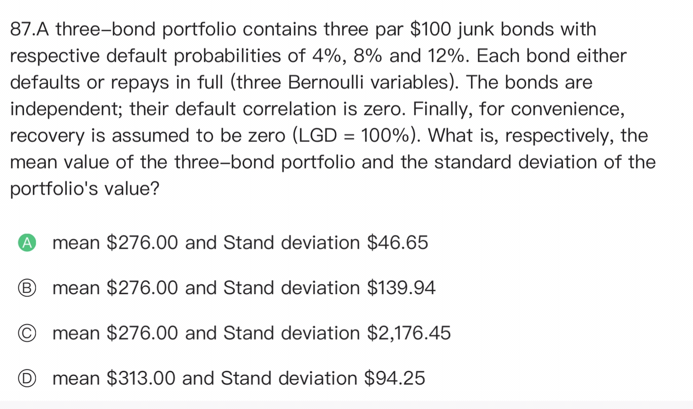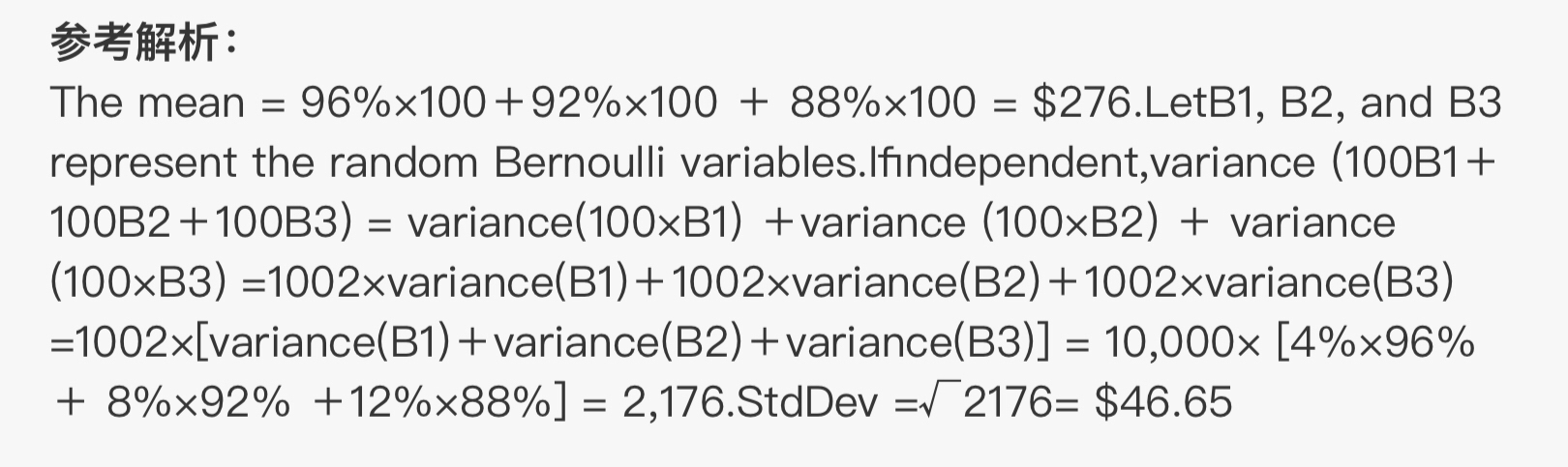 同学你好,是利用三个变量之和方差公式,COV(X,Y,Z)=var(x)+var(Y)+var(Z)+COV(x,y)+cov(y,z)+cov(x,z),由于三个资产独立,所以COV(x,y)+cov(y,z)+cov(x,z)=0,由于三个资产服从伯努利分布,所以var(x)=p(1-p),同时选项中给出的都是金额形式,所以OV(X,Y,Z)=var(x)+var(Y)+var(Z)=OV(X,Y,Z)=var(100*x)+var(100*Y)+var(100*Z)=100^2var(x)+100^2var(Y)+100^2var(Z)