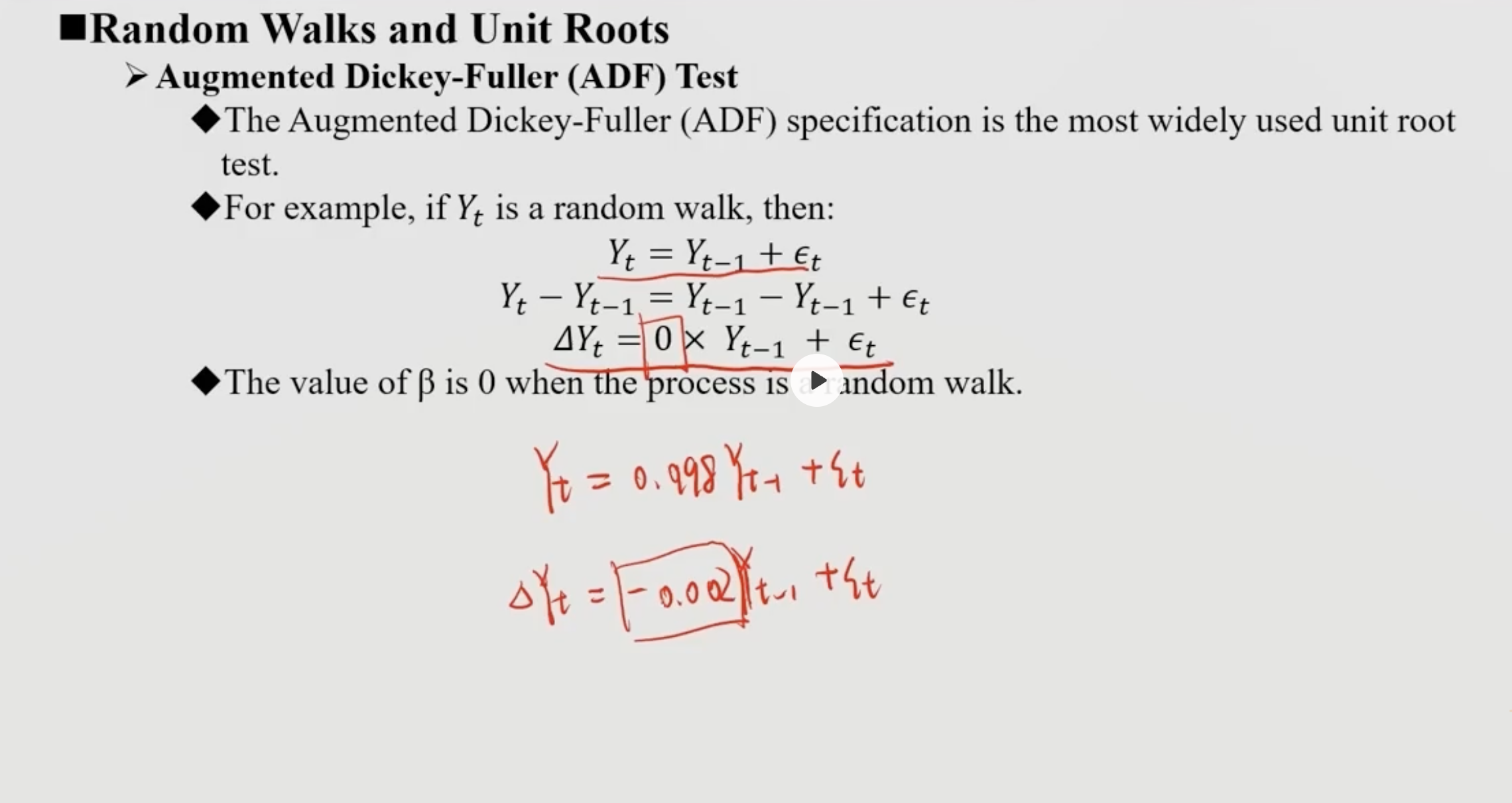 同学你好,老师说的0表示消除了随机游走应该是口误,当Yt-1前面的系数为0,等式右边就只剩下一个残差项,而残差项本身就是随机的,所以该序列就是随机游走的。