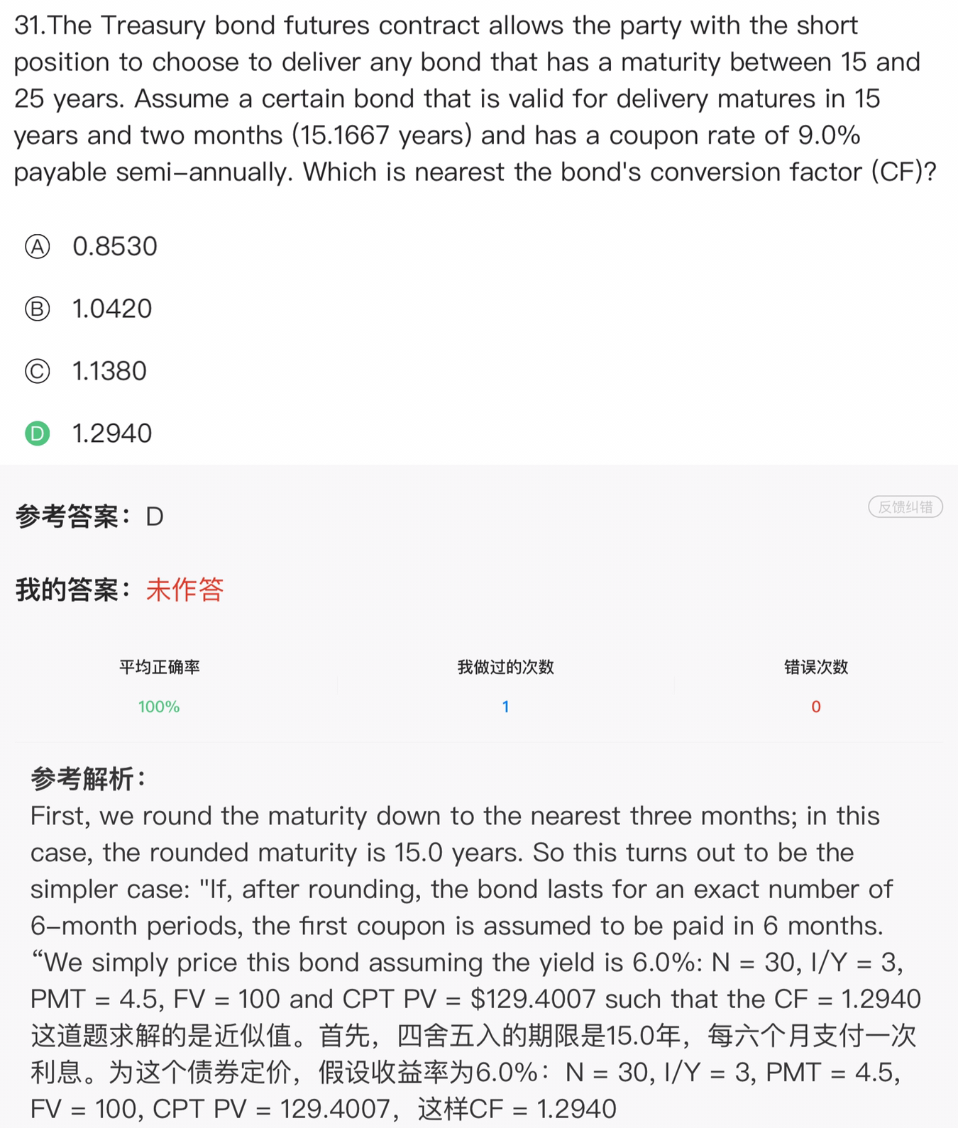 同学你好,这道题比较偏,不建议做这种类型的题目,这里的CF是美国国债期货中的转换因子,用来把期货结算价(FSP)转换成债券现货报价(QBP))来确定交割成本的。当r=6%时,CTD=0,即QBP—FSP*CF=0,所以CF=QBP/FSP, 这道题把FSP看做是债券的面值100,QBP为按照r=6%代入五要素计算出来的PV(129.4007).