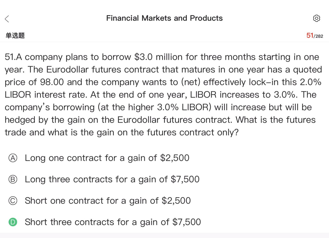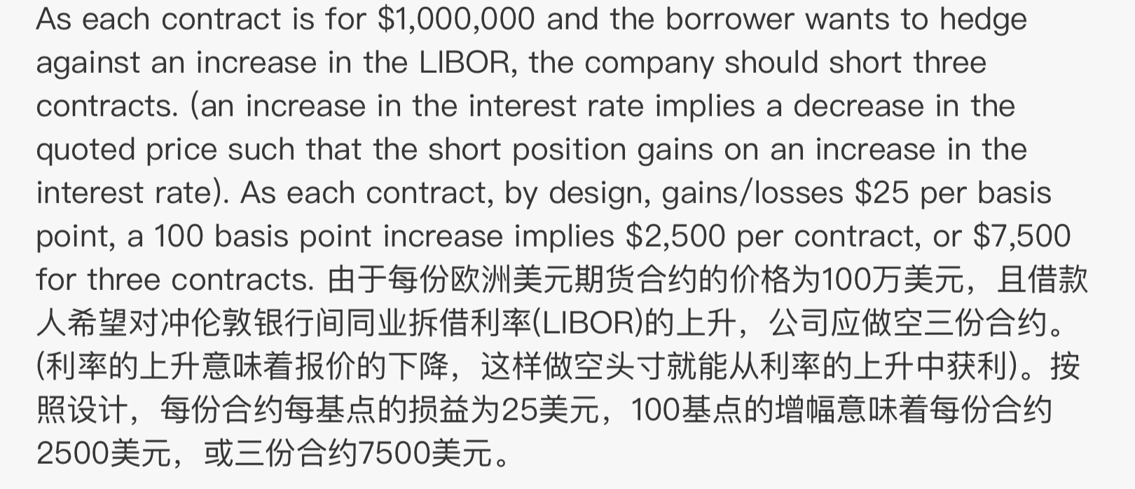 同学你好,理解这道题的关键是要明白欧洲美元期货合约的价格跟市场利率是呈反向关系,利率上涨,期货合约价格下降,所以做空期货合约可以获利。